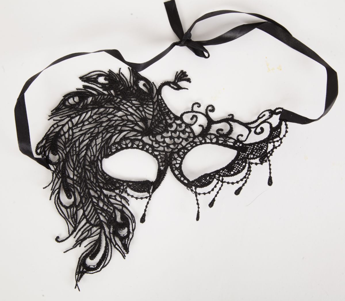 Кружевная маска в венецианском стиле с узором жар-птицы. Завязывается на атласные ленты. Упаковка - бумажный пакет. Размеры - 22 х 18 см.