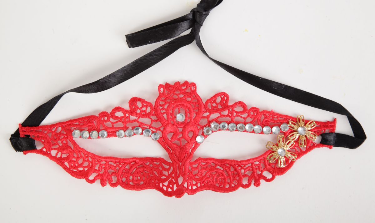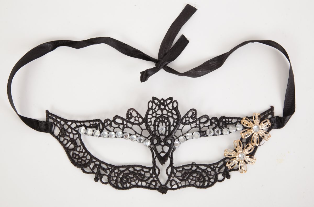 Кружевная маска в венецианском стиле с многочисленными узорами, стразами и цветочками. Завязывается на атласные черные ленты. Упаковка - картонный конверт. Размеры - 22,5 х 8,5 см.