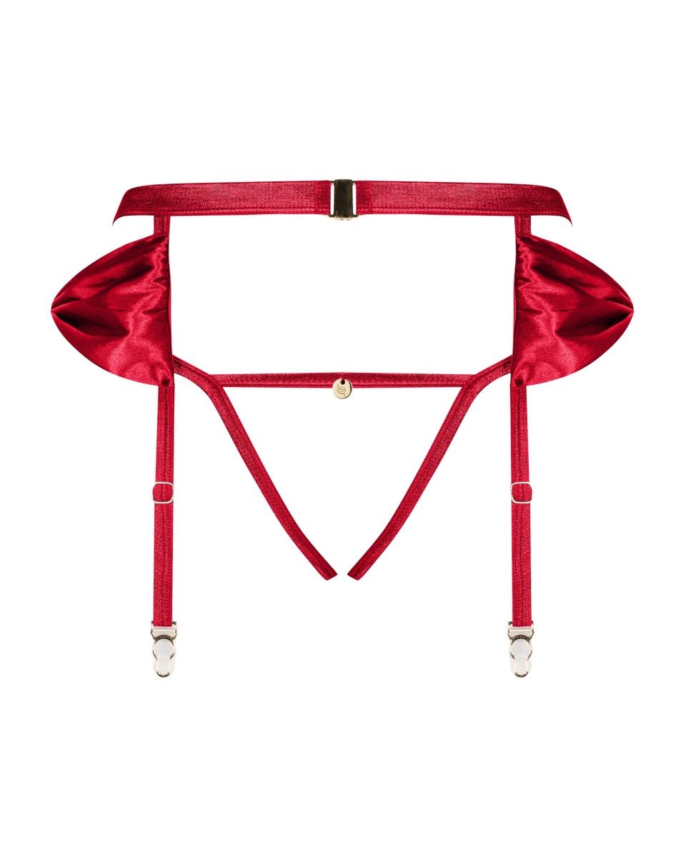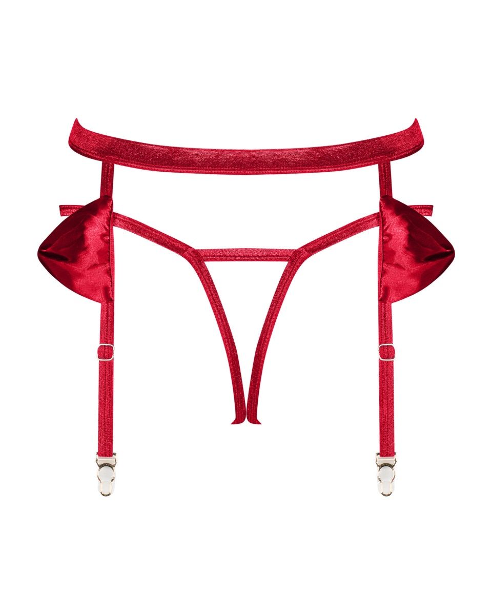 Изящный аксессуар Rubinesa: представляет собой пояс для чулок и стринги с открытой промежностью из красных эластичных союзок. У пояса на спине застежка, пажи для чулок регулируются по длине, на бедрах атласные банты.