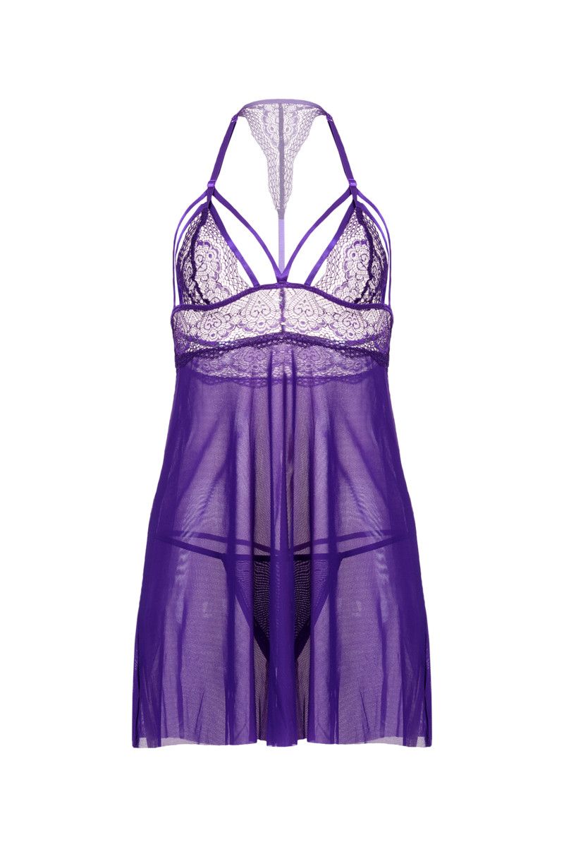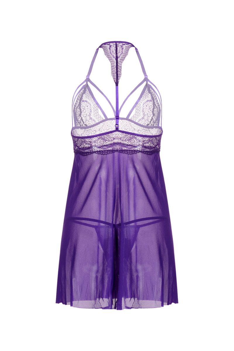 Комбинация бэби-долл из мягкой эластичной сетки с кружевным лифом. Декольте подчеркивается пикантными стрепами. Длинная регулируемая бретель обхватывает шею спереди, сзади дополнена кружевным элементом и более короткой регулируемой бретелью. В комплекте Т-стринги из эластичной сетки. В комплекте: сорочка, трусики-стринги.