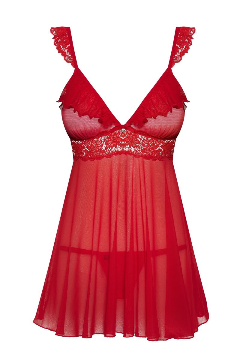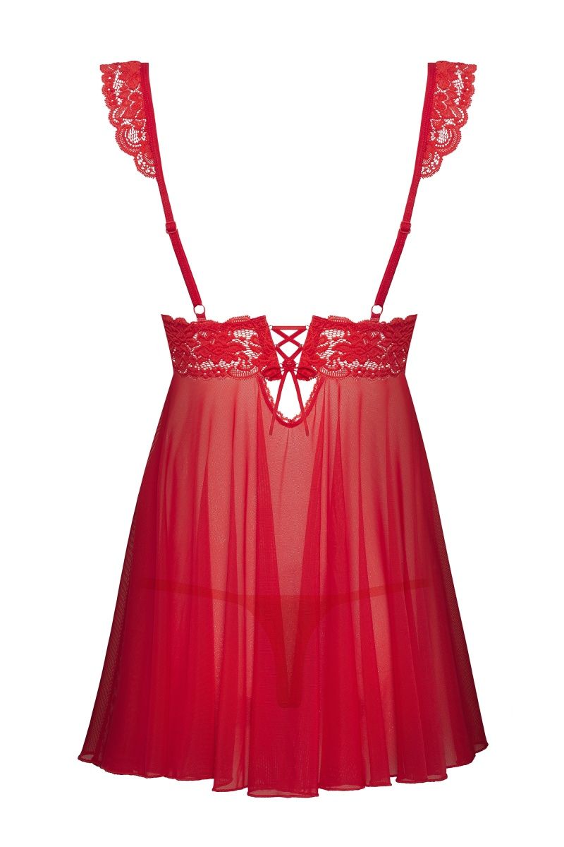 Бэби-долл и стринги. Изделие украшено кружевом и шнуровкой на спинке. Бретели регулируются. В комплекте: бэби-долл и стринги.