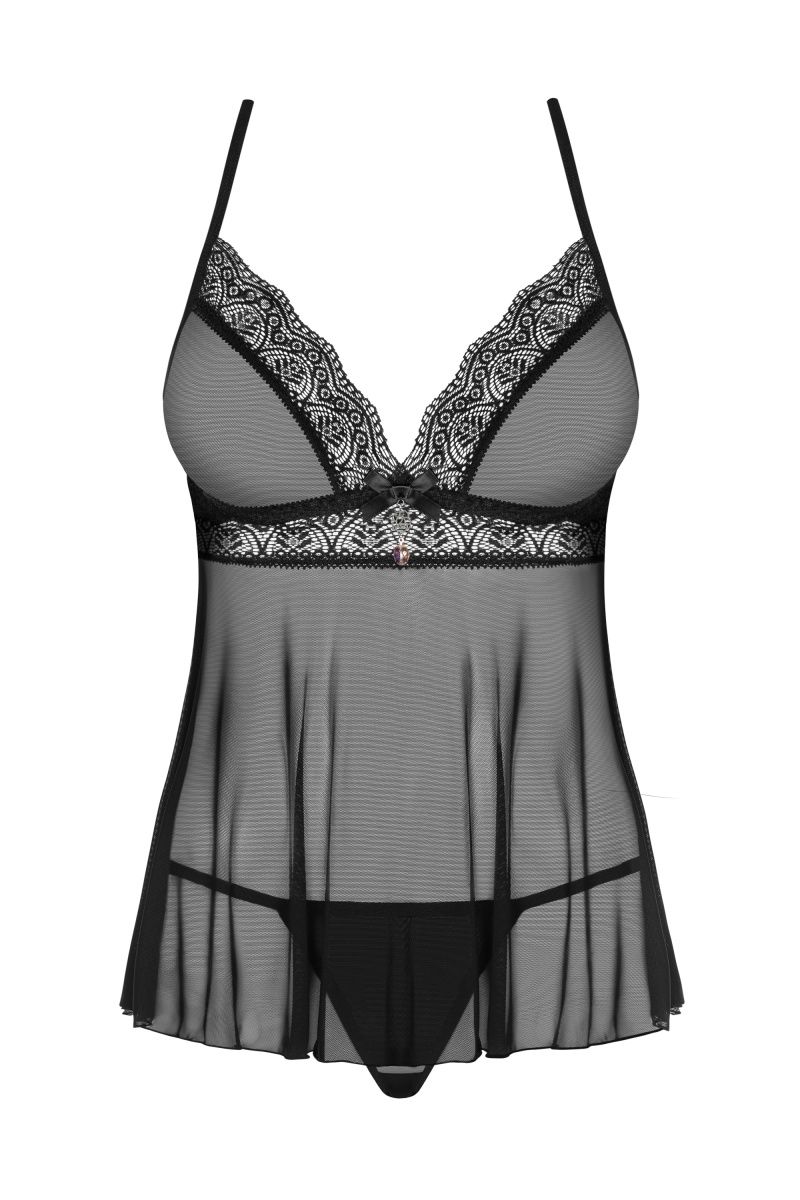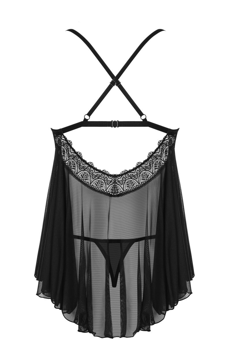 Прозрачная сорочка бэби-дол с кружевными вставками, бретели регулируются. Сорочка на лямочках перекрещенных на спинке и на застёжке. В комплекте: сорочка и трусики-стринги.