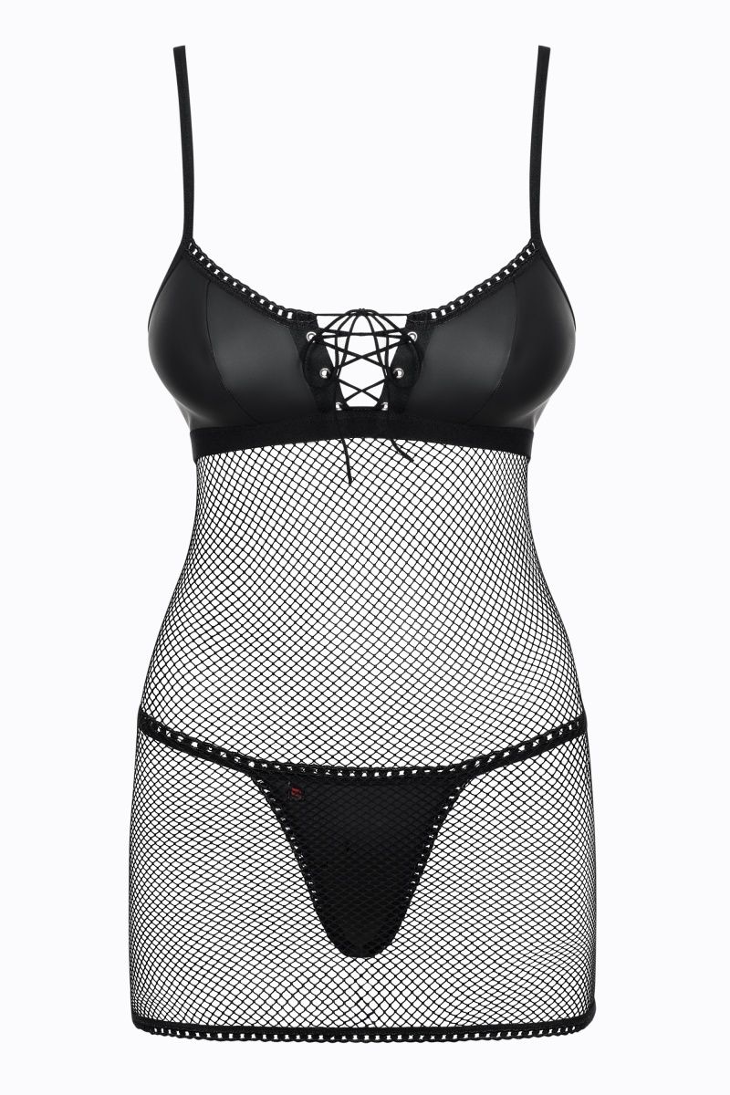 Соблазнительная сорочка Redella выполнена из мягкой сеточки и эластичной эко-кожи. Лиф сорочки мягкий без косточек, декорирован шнуровкой. Бретели и застежка на спинке регулируются. В комплекте: сорочка и трусики-стринги.