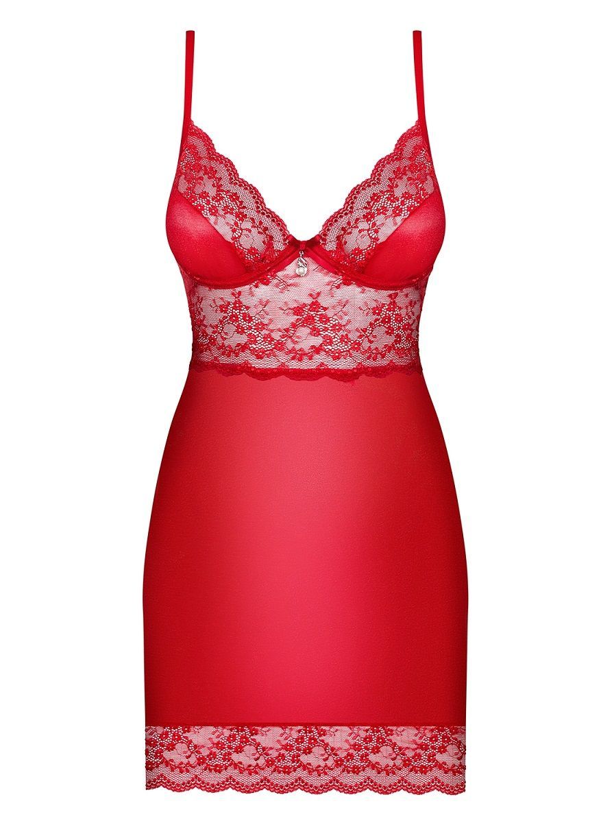 Сорочка насыщенного красного цвета из атласного материала, чашка мягкая на косточке со вставками из кружева, застежка на косточках, под грудью широкая вставка из кружева, низ сорочки обрамлён кружевом. В комплект входят трусики стринги. В комплекте: сорочка, трусики-стринги.