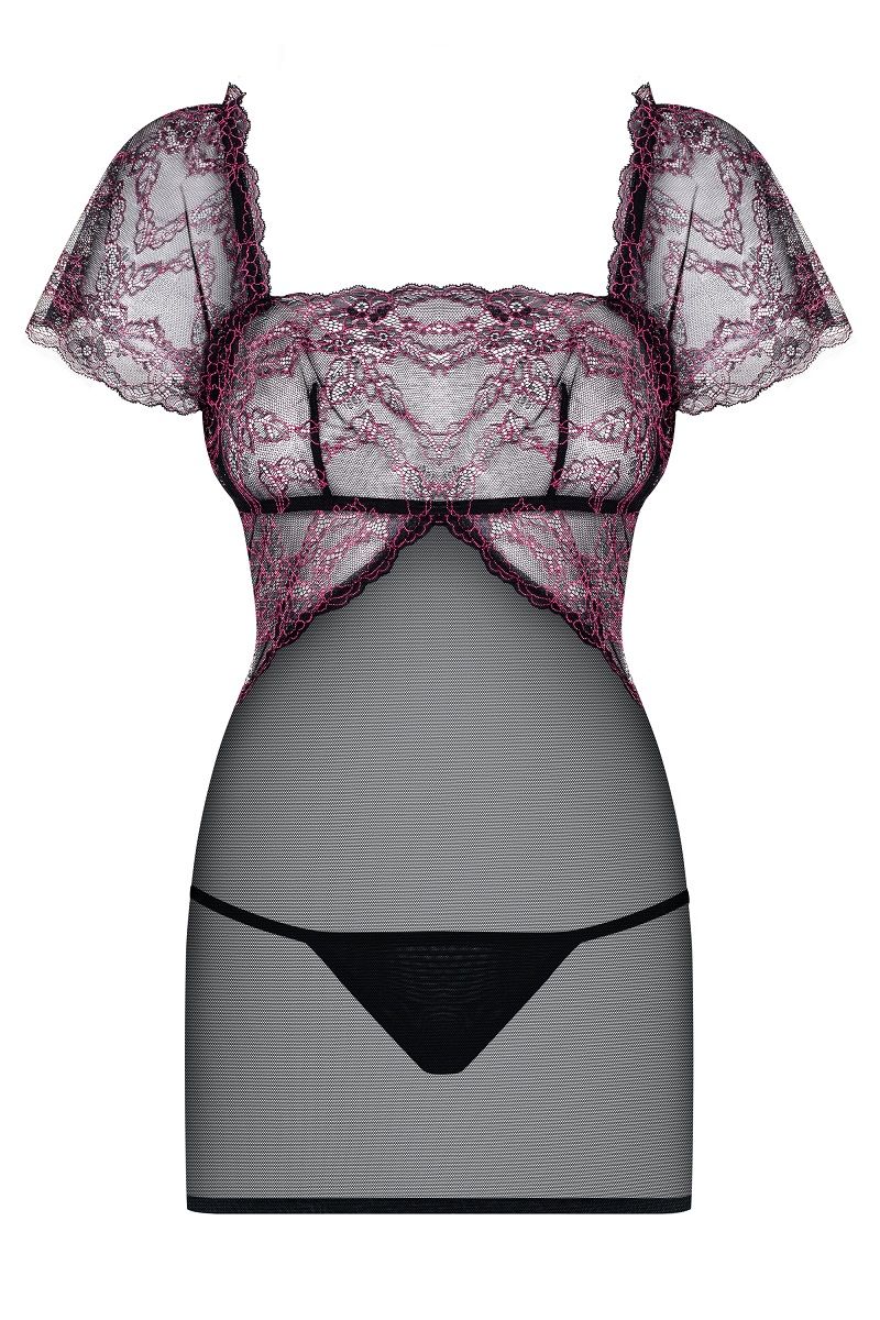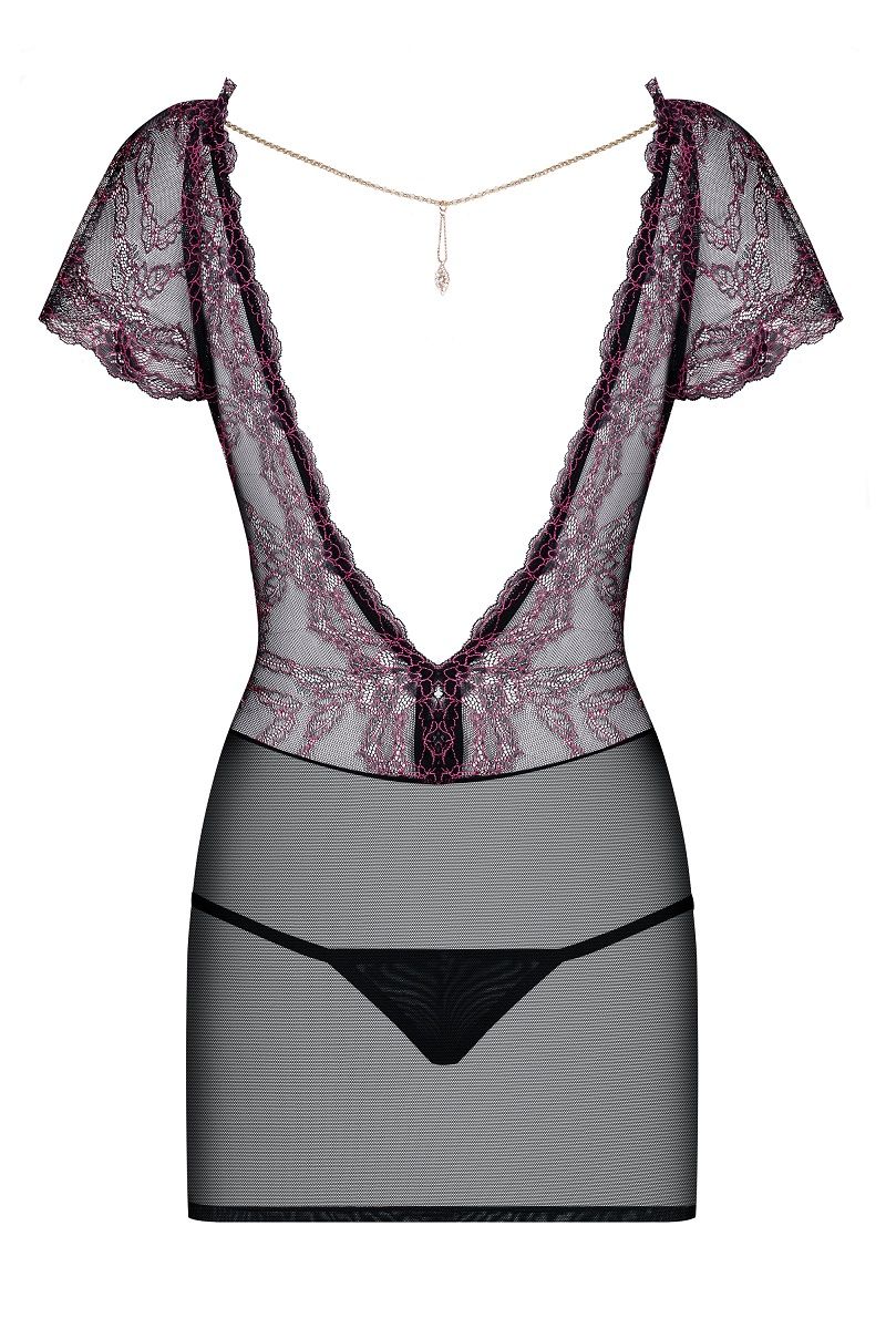 Восхитительное сочетание прозрачной сетки и кружева в коротенькой сорочке. Элегантный перед и соблазнительная спинка! Открытая спина с уникальным, блестящим украшением. Кружевные короткие рукава деликатно прикрывают плечи. Небольшие черные стринги в комплекте. В комплекте: сорочка, трусики-стринги.