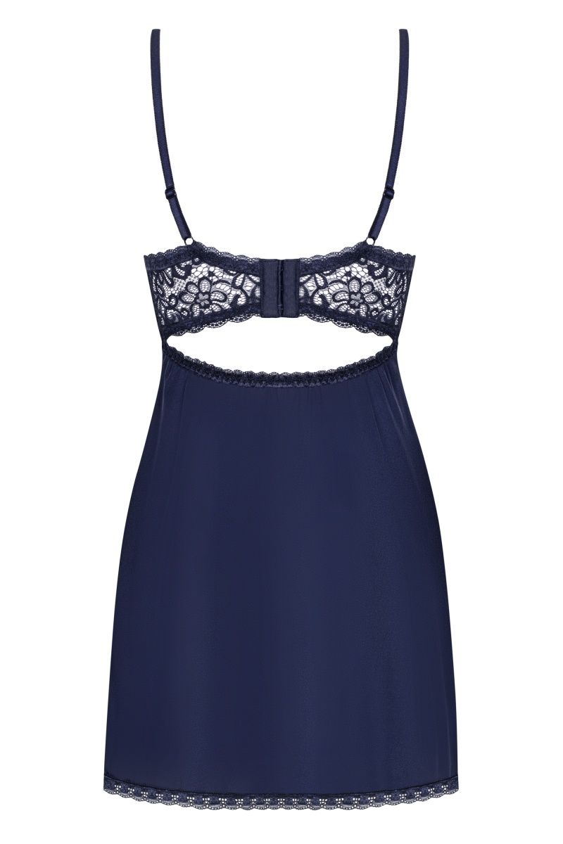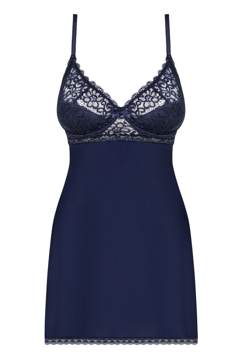 Женственная сорочка выполнена из эластичной гладкой ткани. Модель подходит для обладательниц пышной груди благодаря чашечкам на косточках с поролоном в нижней части. Лиф украшен кружевом с цветочным орнаментом на бежевом подкладе и атласным бантиком в центре. Кокетливый вырез на спинке присборен с помощью резинки. Сзади застежка на три ряда крючков для наилучшего прилегания. Бретели регулируются по длине. В комплекте: сорочка и трусики-стринги.