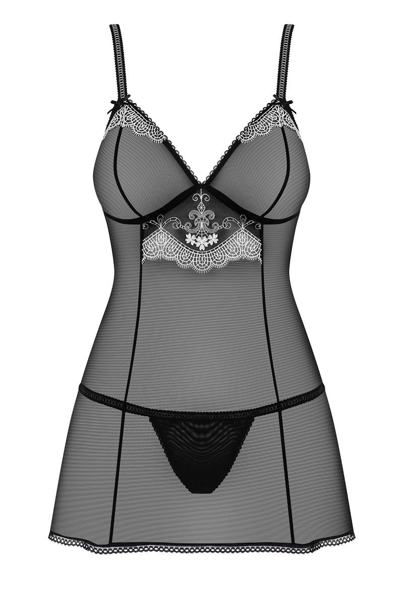 Полупрозрачная сорочка бэби-долл с изысканной кружевной отделкой. В комплекте: сорочка, трусики-стринги.