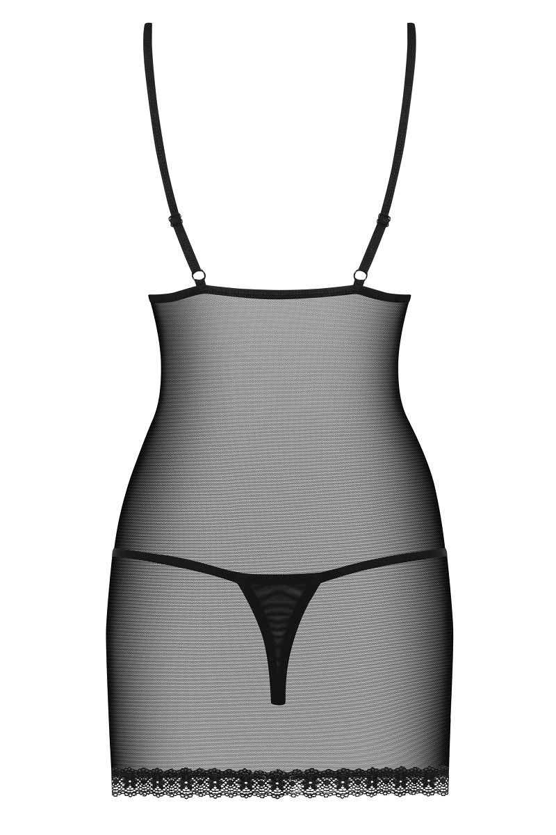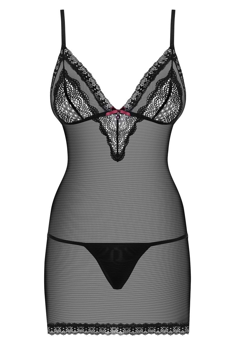 Полупрозрачная сорочка, зону декольте украшает атласный бантик с подвеской, в комплект входят трусики. В комплекте: сорочка, трусики-стринги.