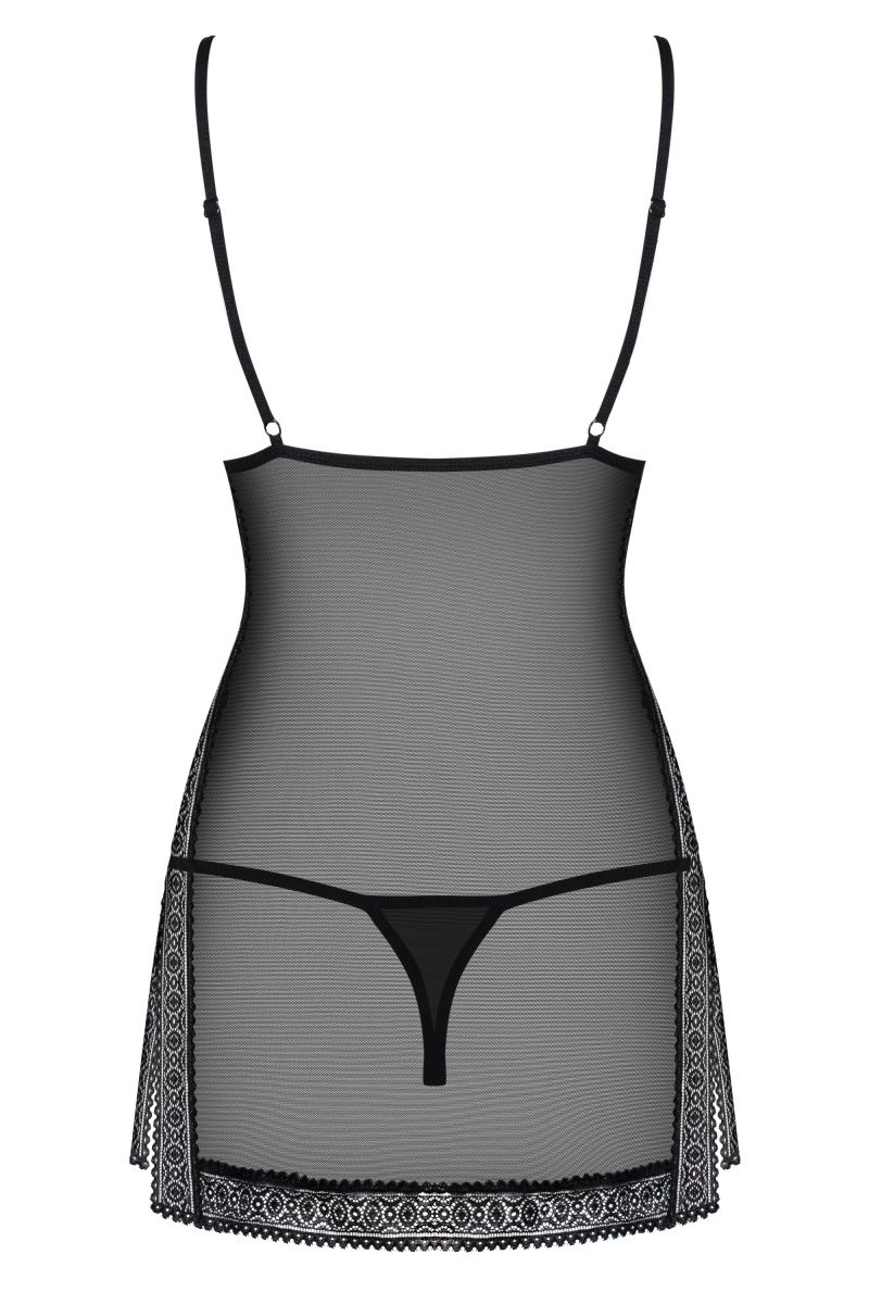 Полупрозрачная сорочка. Сорочка с мягкой чашкой и разрезами по бокам, бретели регулируются по длине.В комплекте кружевные стринги. В комплекте: сорочка, трусики-стринги.