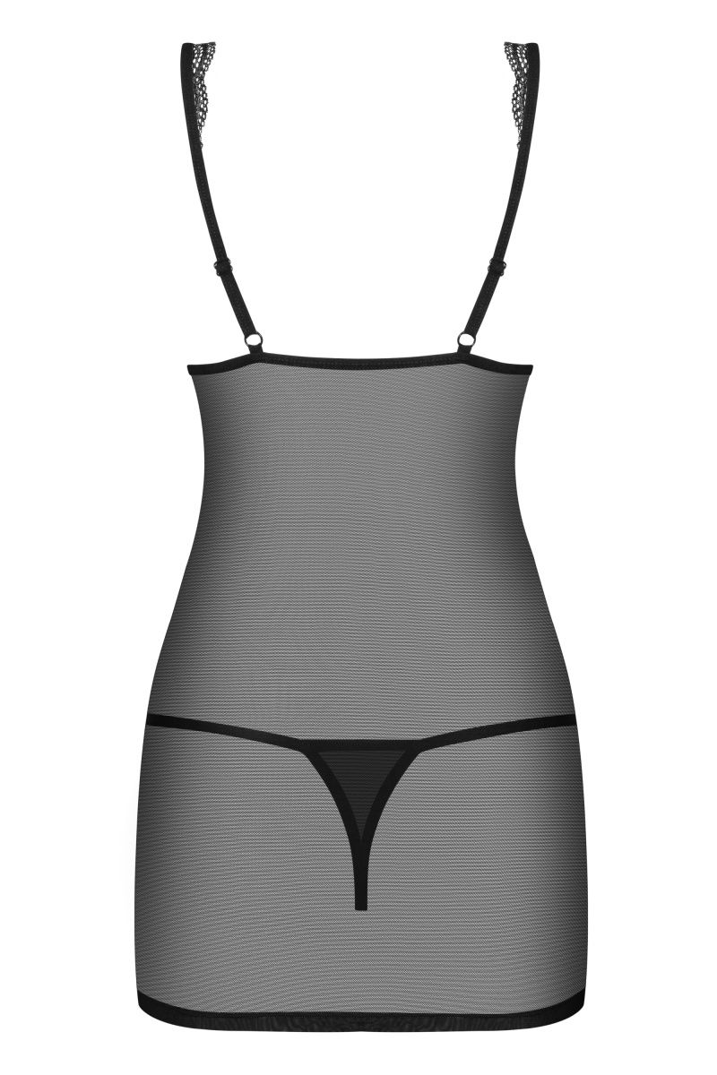 Полупрозрачная короткая сорочка с V-образным вырезом сорочки. Декорирована кружевом, бретели регулируются. В комплекте: сорочка и трусики-стринги.