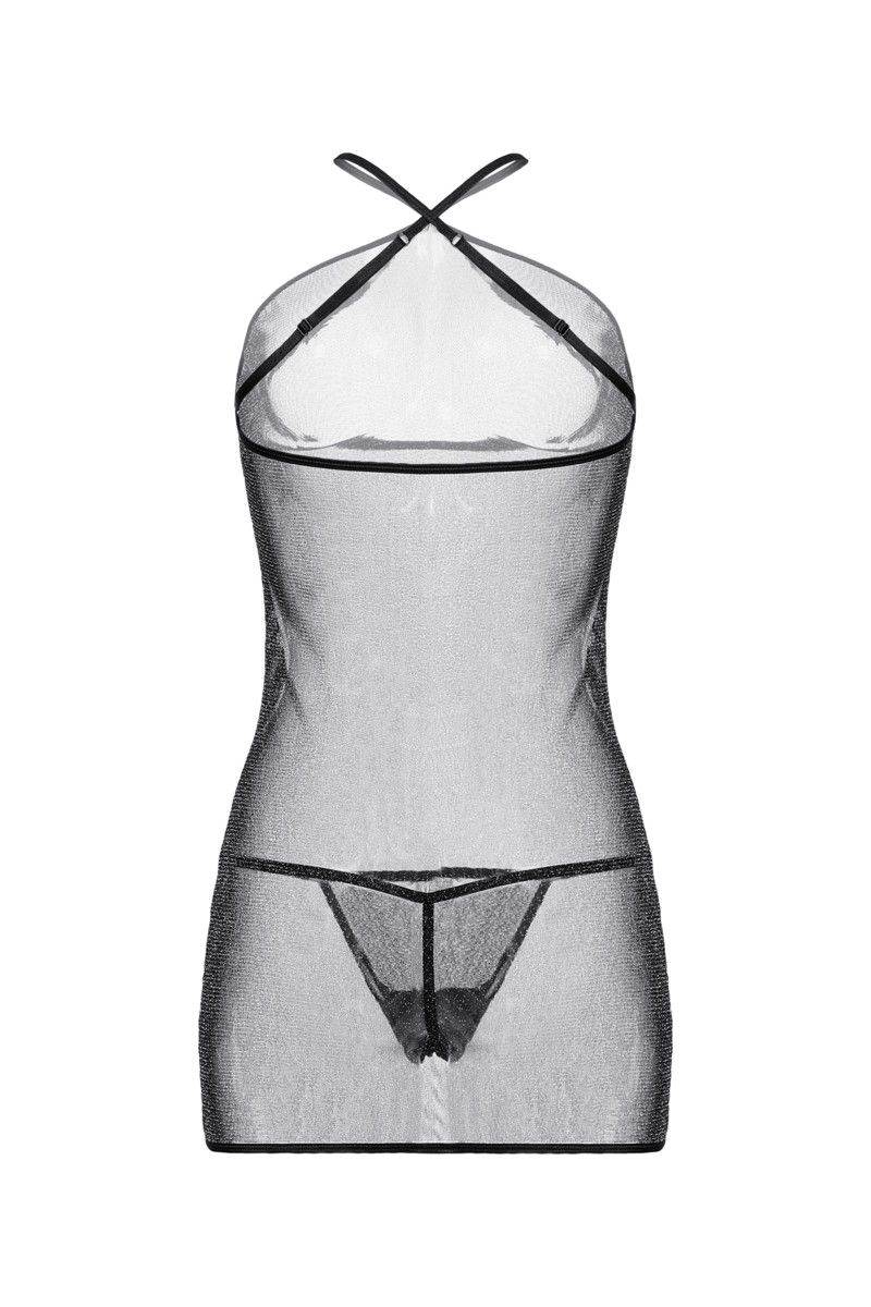 Прозрачная комбинация и Т-стринги, выполненные из мягкого трикотажа с добавлением люрекса. Регулируемые перекрестные бретели комбинации обеспечивают прекрасную посадку. В комплекте: сорочка, трусики-стринги.