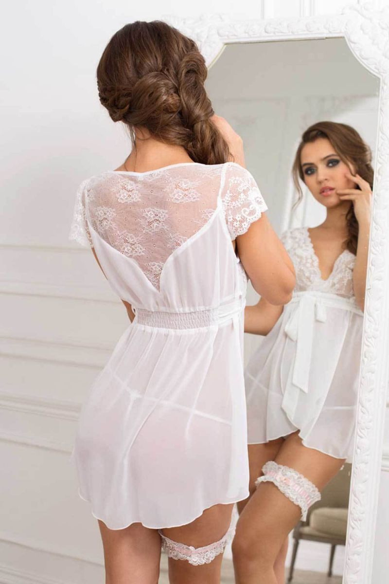 Сорочка бэби-долл полуприлегающего силуэта, из тонкого шифона и кружева с поясом под грудью и запахом, имитирующим халат. Лиф полочки выполнен из двух видов ткани: центральная часть - из кружевного полотна, боковые части - из кружевного полотна и шифона. Верхняя часть спинки с притачной фигурной, в виде сердца, кокеткой из кружевного полотна, делает модель оригинальной. Нижняя часть полочки и спинки со вставкой буфы позволяет регулировать желаемый объем изделия. Трусики и подвязка не входят в комплект!