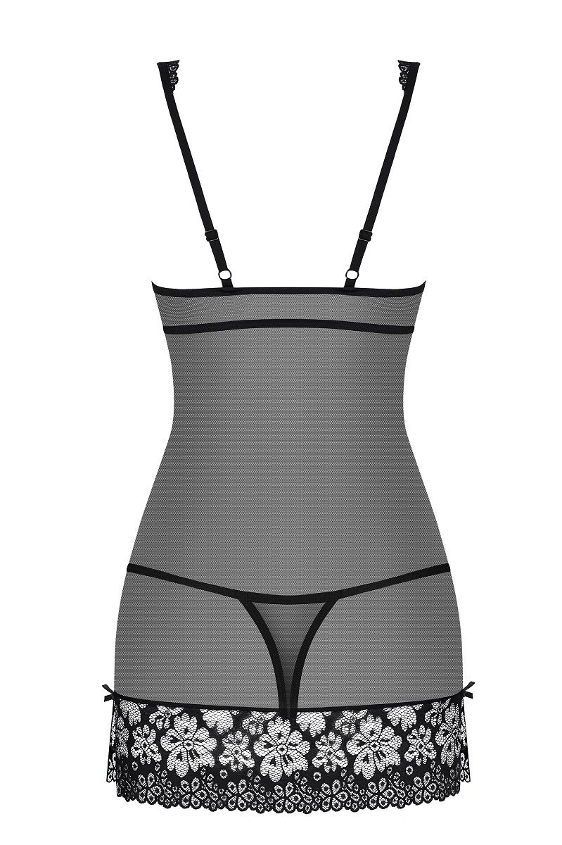 Сорочка выполнена из полупрозрачной сеточки в сочетании с отделкой из красивого цветочного кружева, бретели регулируются. В комплекте: сорочка, трусики-стринги.