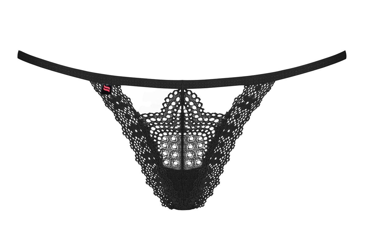 Ажурные трусики-стринги с фиолетовой подвеской и бантиком сзади.
