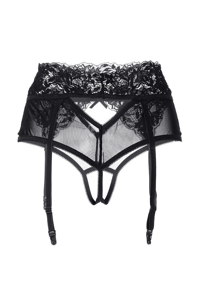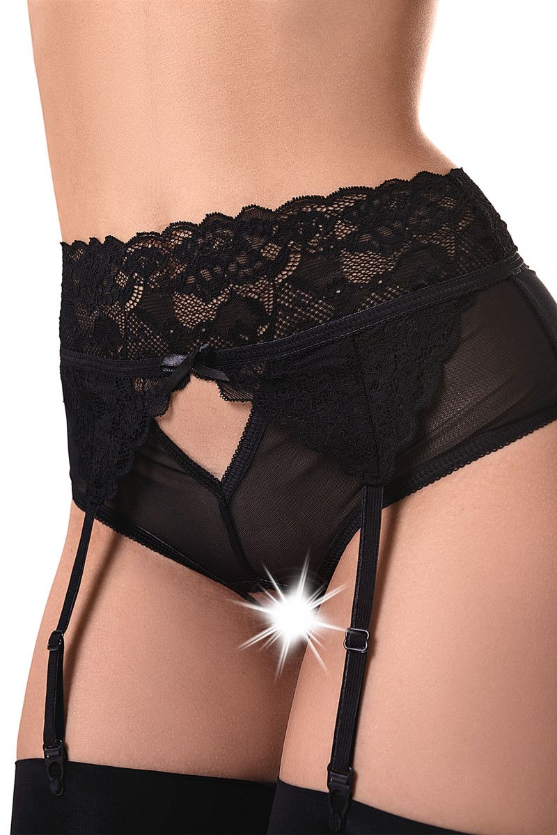 Эротические трусики-пояс из эластичной сетки со вставками кружева, с декоративными вырезами. Имитация пояса со свободным ажурным краем. Высокая посадка. Регулируемые пажи. Допускается замена кружева на аналогичное.