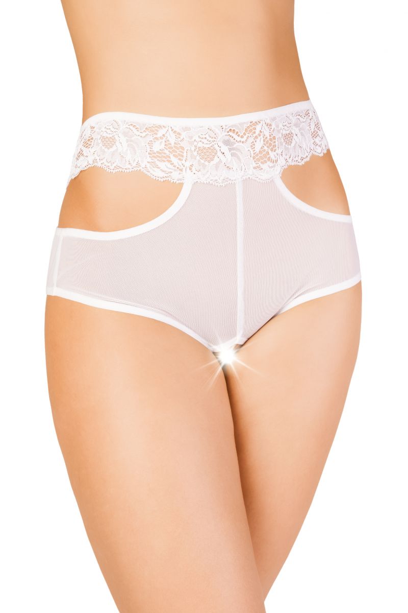 Эротические трусики из эластичной сетки со вставками кружева, с декоративными вырезами по бокам. Перекрестные кружевные полосы сзади. Высокая посадка. Допускается замена кружева на аналогичное.