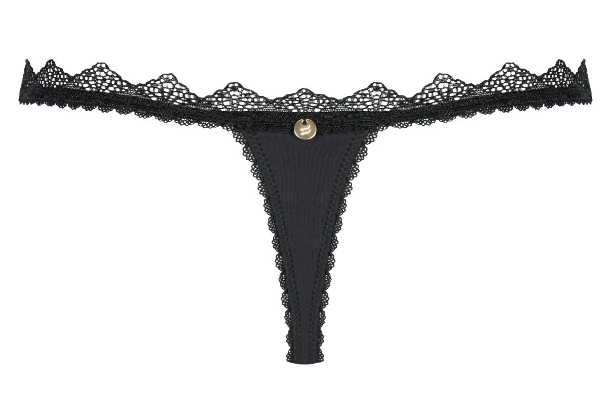 Женские трусики-стринги, украшенные кружевом. Спереди оригинальные перекрещенные ремешки из бархатистой ткани, а также золотистое украшение.