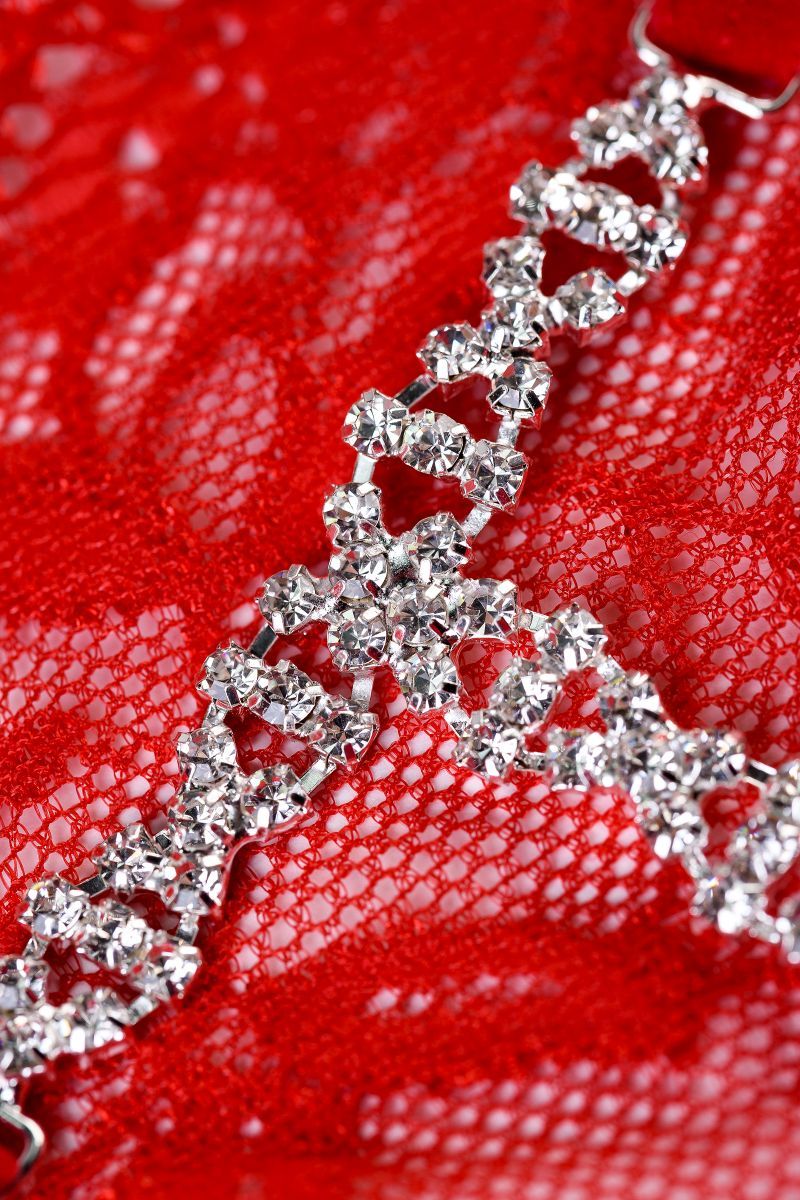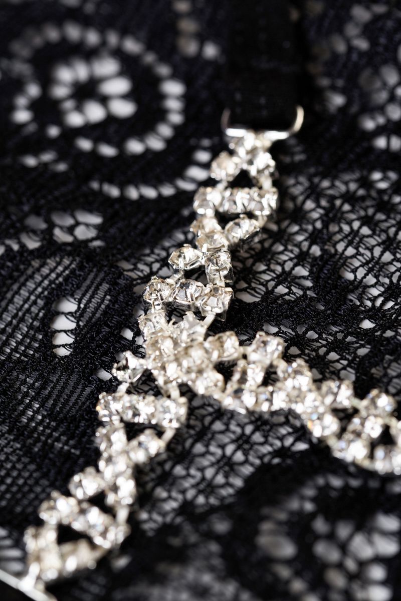 Изящное кружево с цветочным орнаментом спереди. Плетеная косичка из страз у основания ягодиц придает сексуальному образу блеска и яркости.
