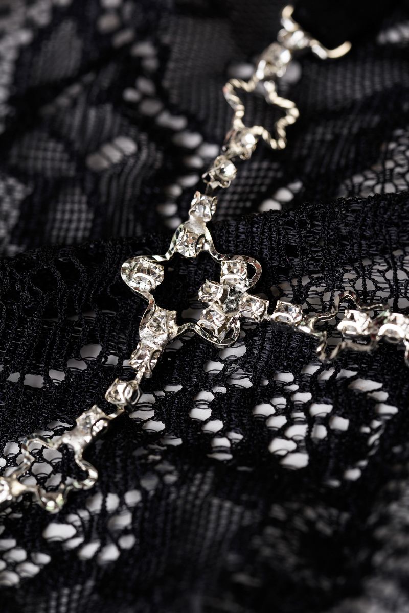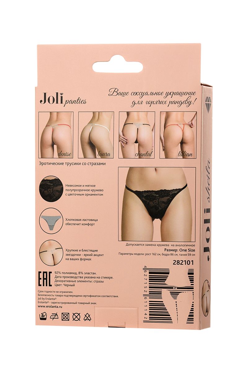 Миниатюрные трусики выполнены из черного кружева с цветочным орнаментом. Нежные и невесомые, с хлопковой ластовицей и мягкими лямками обеспечат комфорт своей хозяйке. Хрупкие и блестящие звездочки у основания ягодиц - деталь, которая заворожит вашего партнера.
