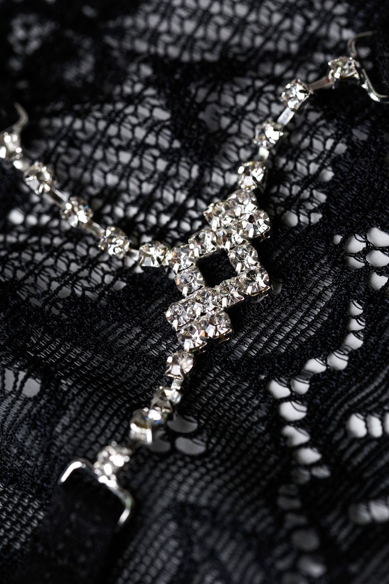 Невесомое и полупрозрачное кружево с цветочным орнаментом спереди. Изящная и легкая деталь, выполненная из блестящих страз придает сексуальному образу роскошной элегантности.