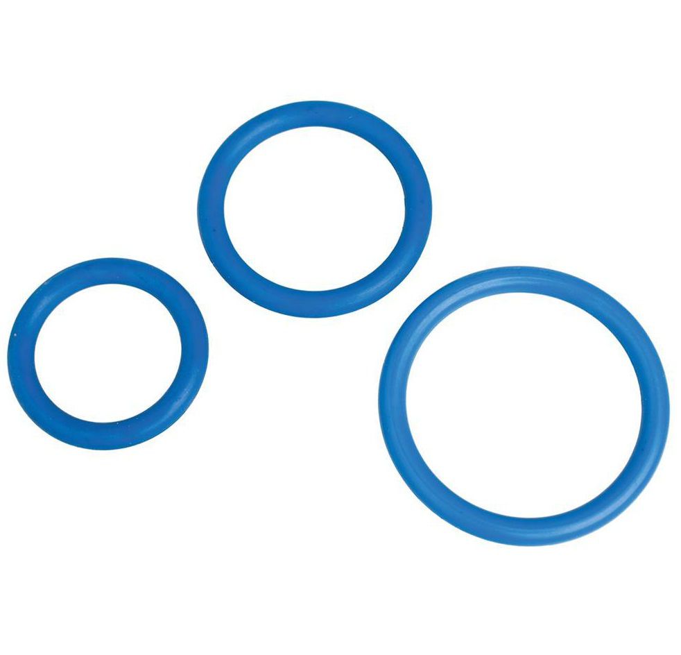 Набор из 3 синих эрекционных колец MENZSTUFF COMPLETE SET OF COCKRINGS. Отлично растягиваются. Могут использоваться как по отдельности, так и все сразу. Диаметр колец - 5, 4 и 3,5 см.