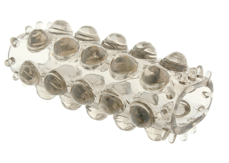 Насадка на пенис дымчатого цвета. Имеет рельеф в виде пупырышек, по краям насадки есть дополнительные мягкие шипы. Легко растягивается, не имеет постороннего запаха.