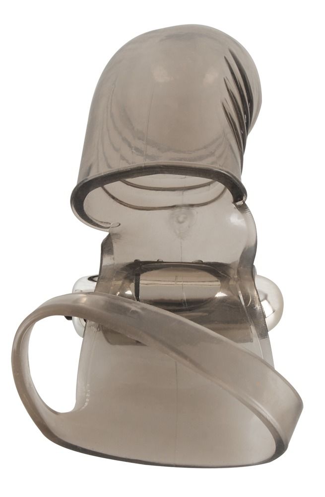 Дымчатая закрытая насадка на пенис с вибропулей. С подхватом мошонки.