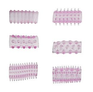 Набор из 6 фиолетовых насадок на пенис с различным рельефом.