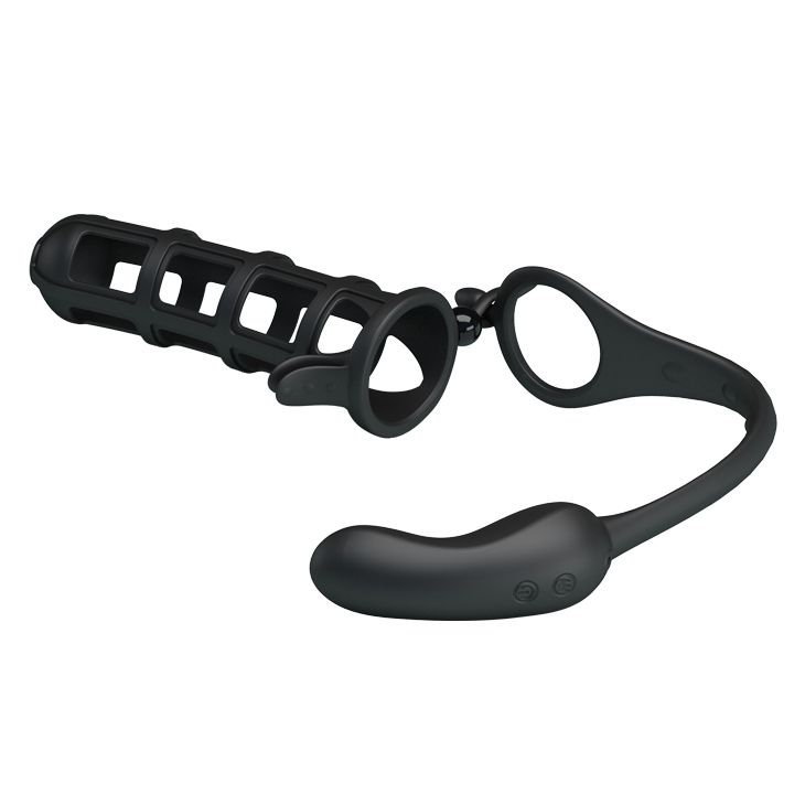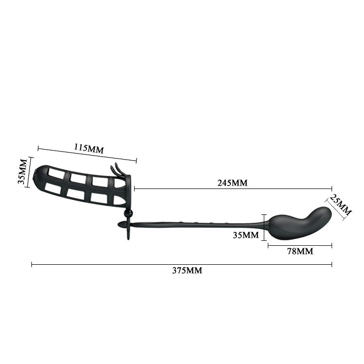 Закрытая силиконовая насадка на пенис и перезаряжаемый анальный стимулятор могут быть использованы как вместе, так и по отдельности. Рабочая длина насадки - 11,5 см.. диаметр - 3,5 см. Длина пробки - 7,8, диаметр - 3,5 см. Длина анального хвоста - 24,5 см.
