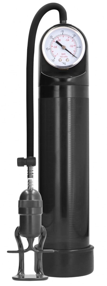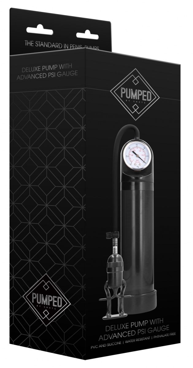 Deluxe Pump With Advanced PSI Gauge – вакуумная помпа, состоящая из колбы с манометром для контроля давления, уплотнителя и ручного насоса в виде поршня. Такого формата рукоятка дает больше, чем груша. Она требует меньшего количества нажатий и быстрее создает более эффективное вакуумное давление. С поршневым насосом легче сохранять контроль над давлением в помпе. Помпа оснащена кнопкой быстрого выпуска воздуха. Для получения максимального эффекта использование помпы должно быть регулярным. В комплекте: помпа, эрекционное кольцо. Внутренний диаметр - 5 см. Рабочая длина - 23 см.