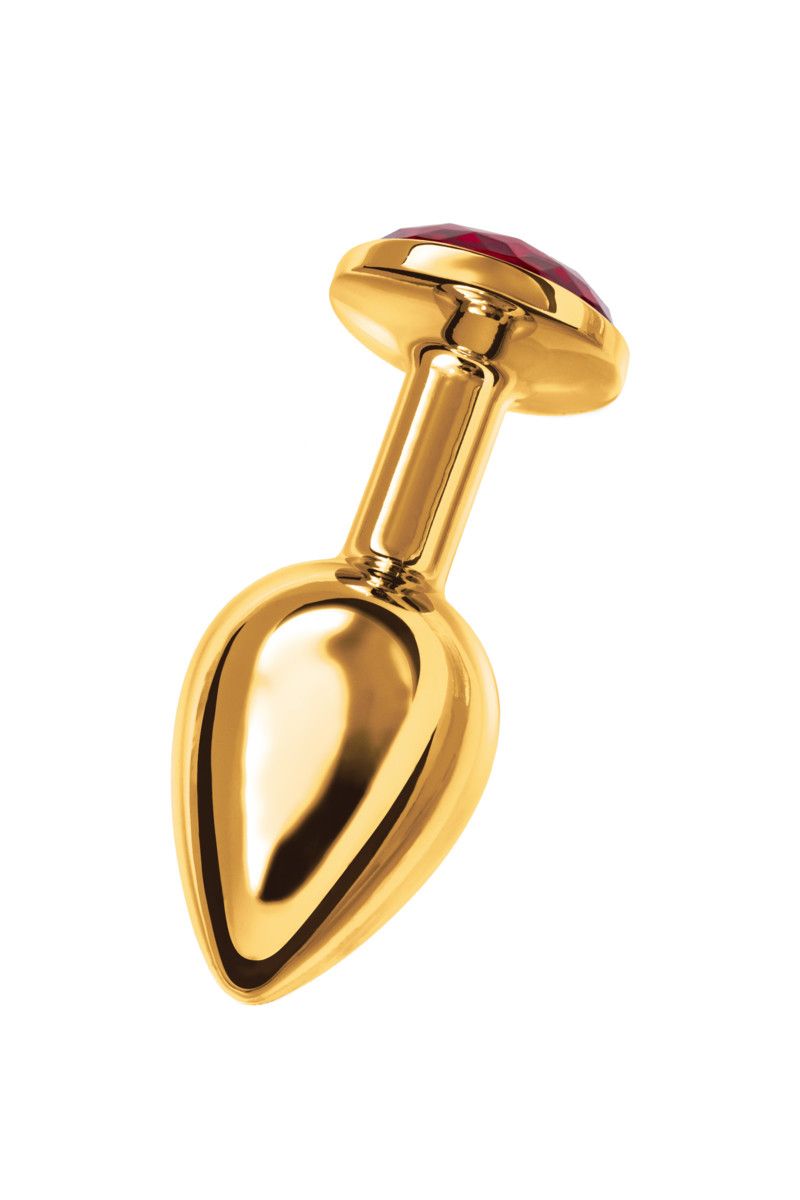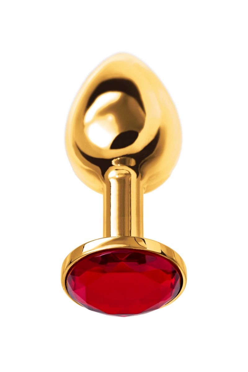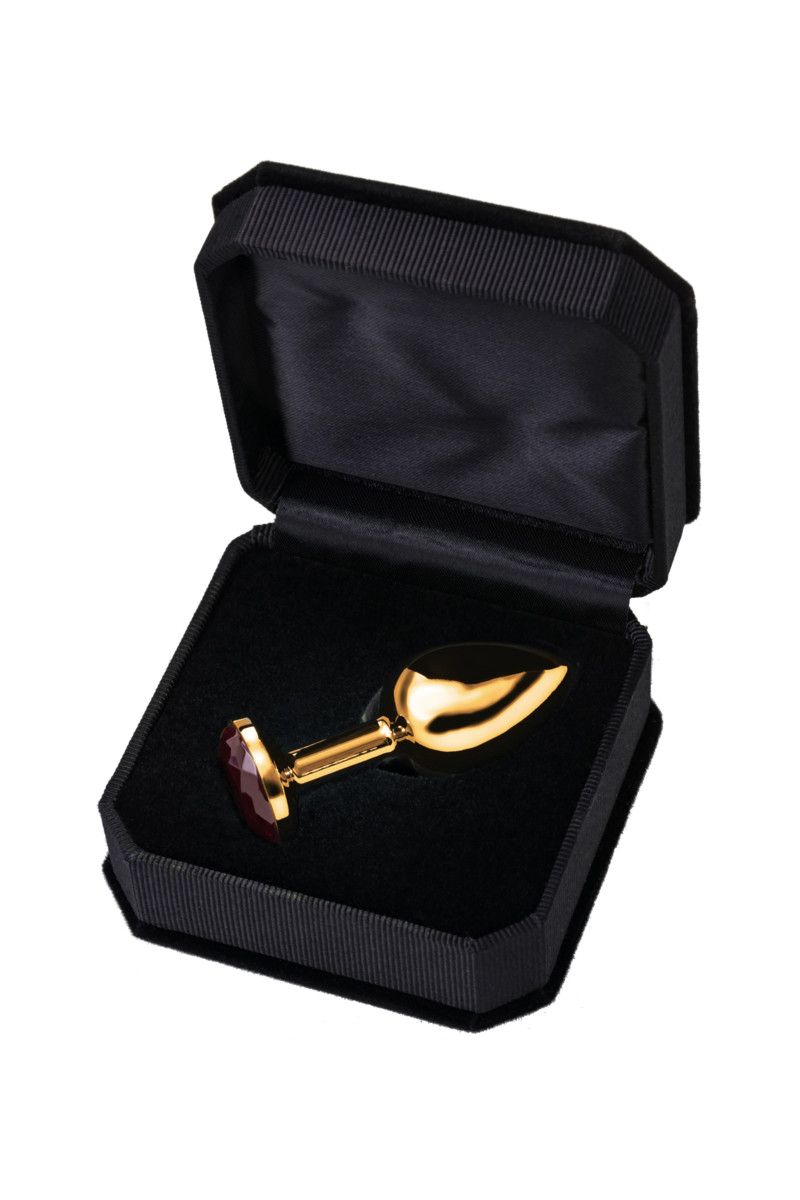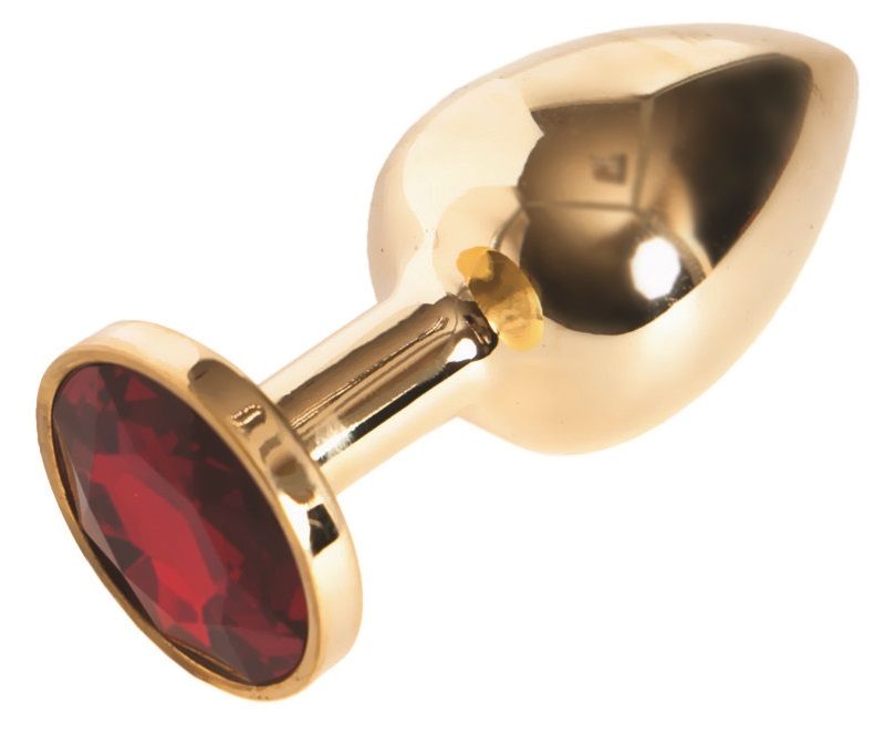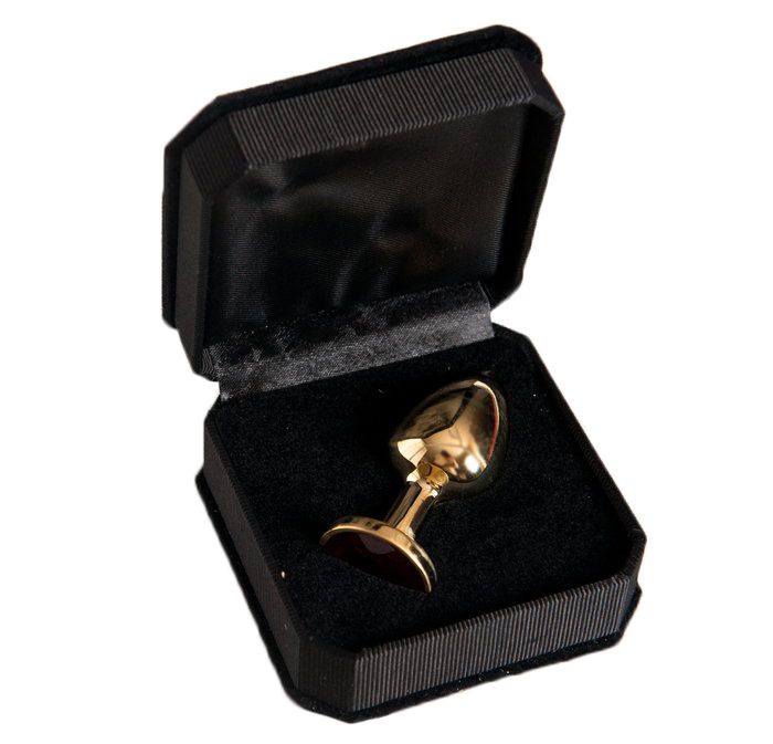 Малая золотистая анальная втулка с красным кристаллом. Поставляется в подарочной упаковке.