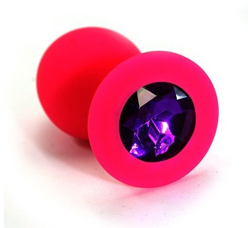 Анальная пробка из силикона розового цвета, размер M. Страз в основании круглой формы, выполнен из стекла темно-фиолетового цвета. Упакована в вельветовый мешочек для хранения. Вес - 46,5 граммов.