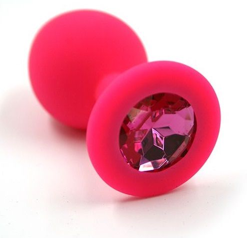 Анальная пробка из силикона розового цвета, размер M. Страз в основании круглой формы, выполнен из стекла темно-голубого цвета. Упакована в вельветовый мешочек для хранения. Вес - 46,5 граммов.