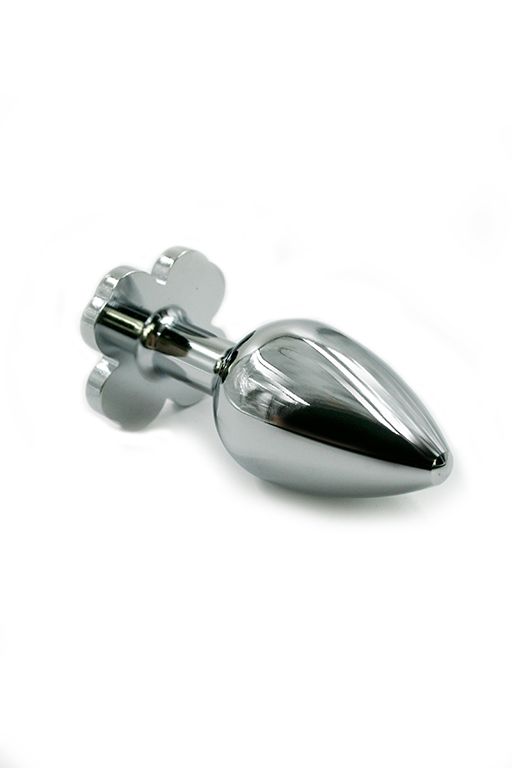 Анальная пробка из алюминия размер S. Страз в форме четырёхлистного клевера выполнен из стекла голубого цвета. Упакована вельветовый мешочек для хранения. Вес - 52 гр.