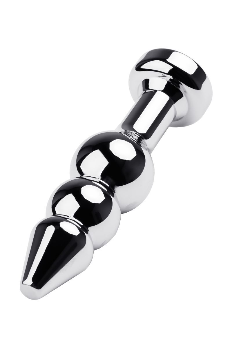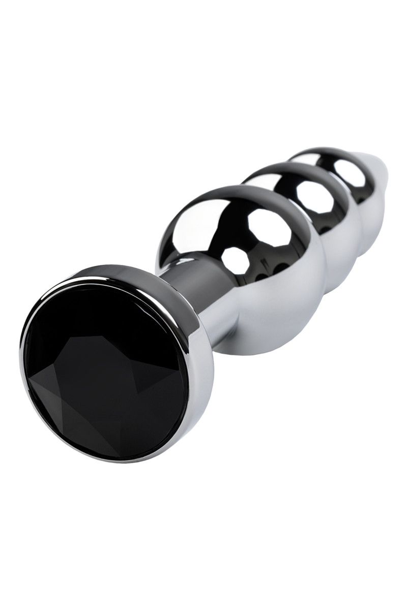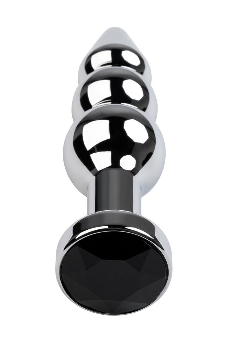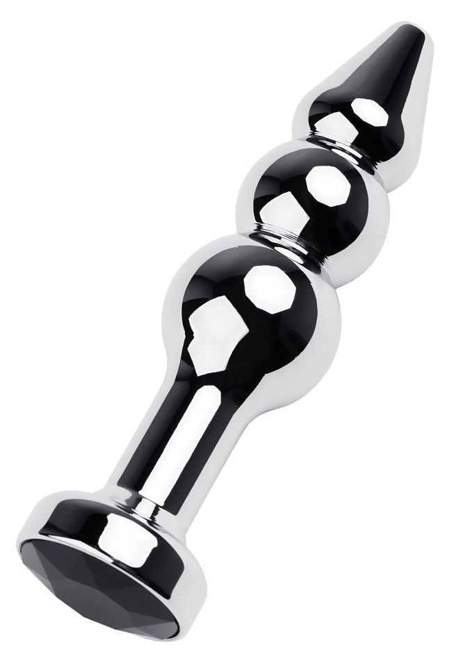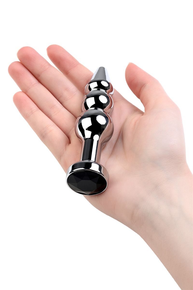 Серебристая анальная втулка оригинальной формы со стразом черного цвета. Удобный для ввода маленький носик плавно переходит в два шара. Еще одна особенность этой игрушки - удлиненное расстояние до стоппера. Рабочая длина - 10 см. Минимальный диаметр - 1,5 см. Вес - 95 грамм.