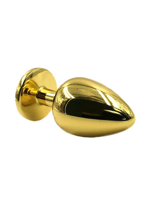 Золотая анальная пробка из алюминия размер S. Страз в основании круглой формы, выполнен из стекла желтого цвета. Упакована в вельветовый мешочек для хранения. Вес - 52 гр.