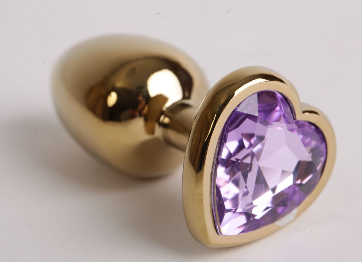 Золотистая анальная пробка с сиреневым сердечком. Металлическая пробка с ограничительным основанием для безопасного использования.