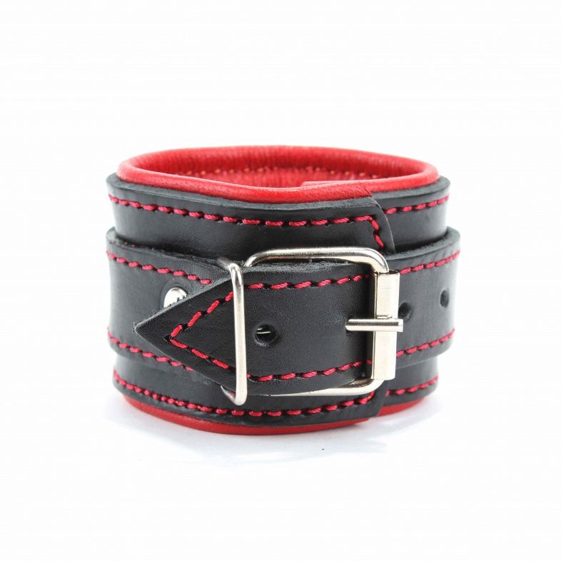Оковы на руки с красным подкладом. Выполнены из толстой ременной кожи черного цвета, подклад мягкая перчаточная кожа ярко красного цвета. На пряжке. Использована усиленная металлическая фурнитура. Строчка толстой ниткой контрастного красного цвета.