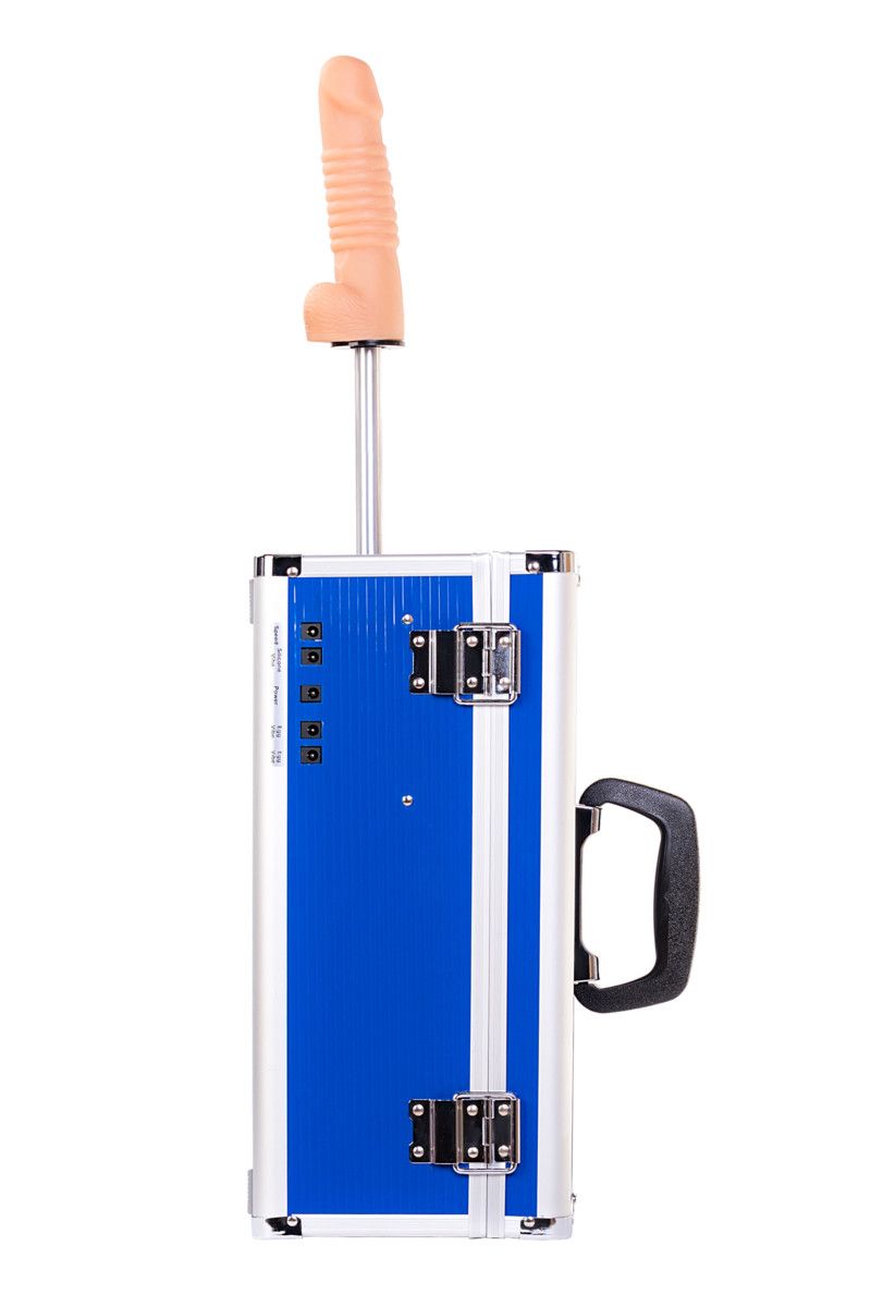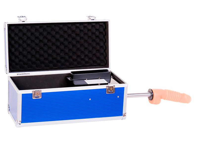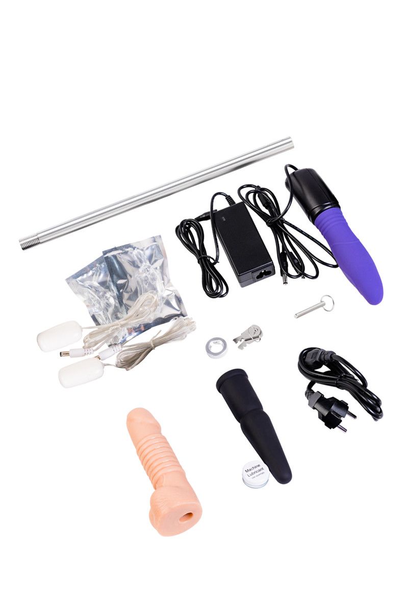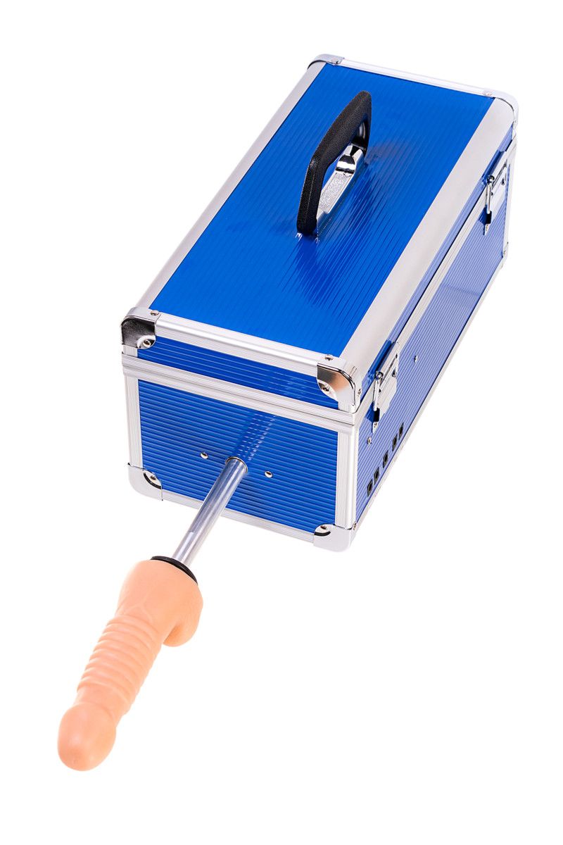 Секс-машина Fuck Box с насадкой-фаллосом работает от сети 220V. Совершает до 200 проникновений в минуту. В комплекте чёрный анальный плаг-насадка, фиолетовый вибромассажёр, 2 виброяичка с насадками в виде розовых кроликов. Габариты - 43 х 43 x 24 см. Длина фаллоса - 16 см.