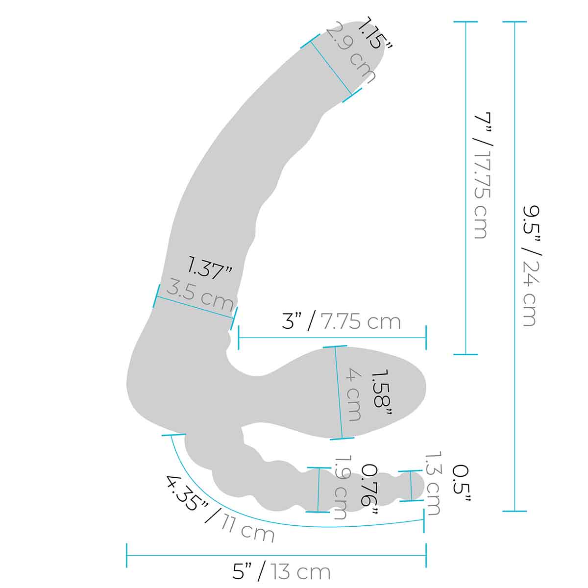 Поднимите свою интимную игру на новый интенсивный уровень с 7-дюймовым безремневым страпоном с пультом дистанционного управления. Это уникальное устройство для удовольствия из качественного силикона предлагает владельцу двойную стимуляцию за счет вагинального и анального проникновения. Вагинальный отросток можно использовать для стимуляции точки G, а анальный отросток состоит из нити бусинок. Управляйте мощными вибрациями дистанционно, с помощью прилагаемого пульта беспроводного управления. Сделанный из шелковисто-гладкого силикона, страпон идеально подходит для игры с партнером. Наслаждайтесь этим девайсом в душе или ванной благодаря его полностью водонепроницаемой конструкции. Рабочая длина - 17,7 см. Длина вагинальной пробки - 7,7 см, диаметр - 4 см. Длина анального стимулятора - 13 см, диаметр - 1,9 см.