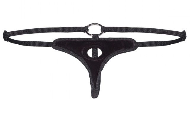 Трусики-стринги с регулирующимся размером с декоративным кольцом сзади. Мягкая часть из бархатного материала внутри с поролоном и вшитым внутрь кольцом для крепления фаллоса. Размер: 13-19 см.
