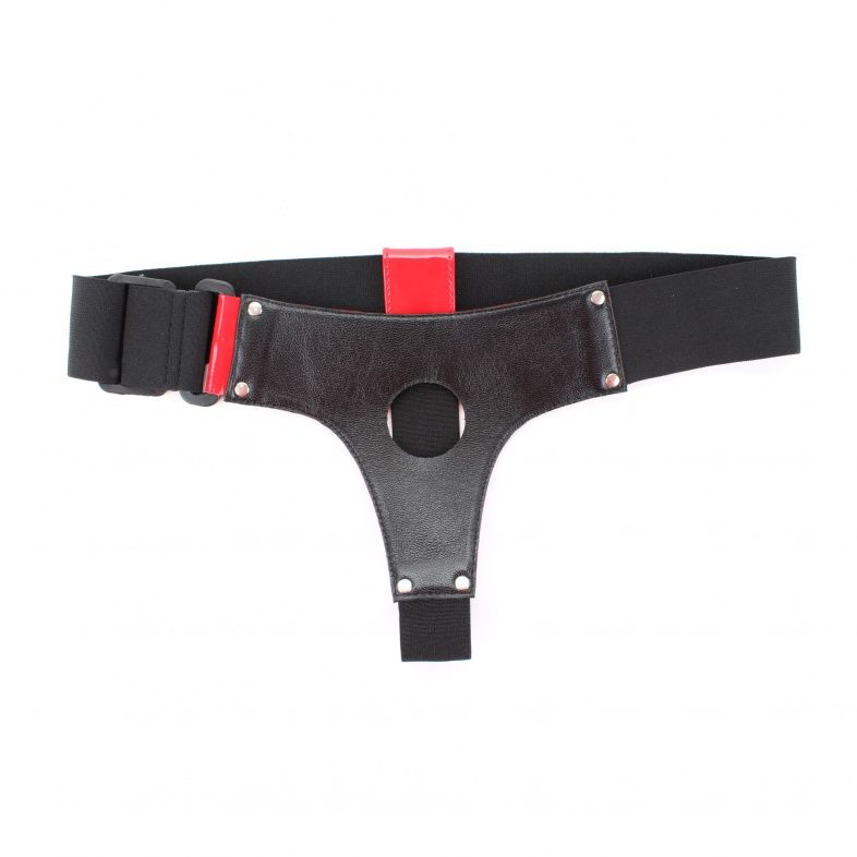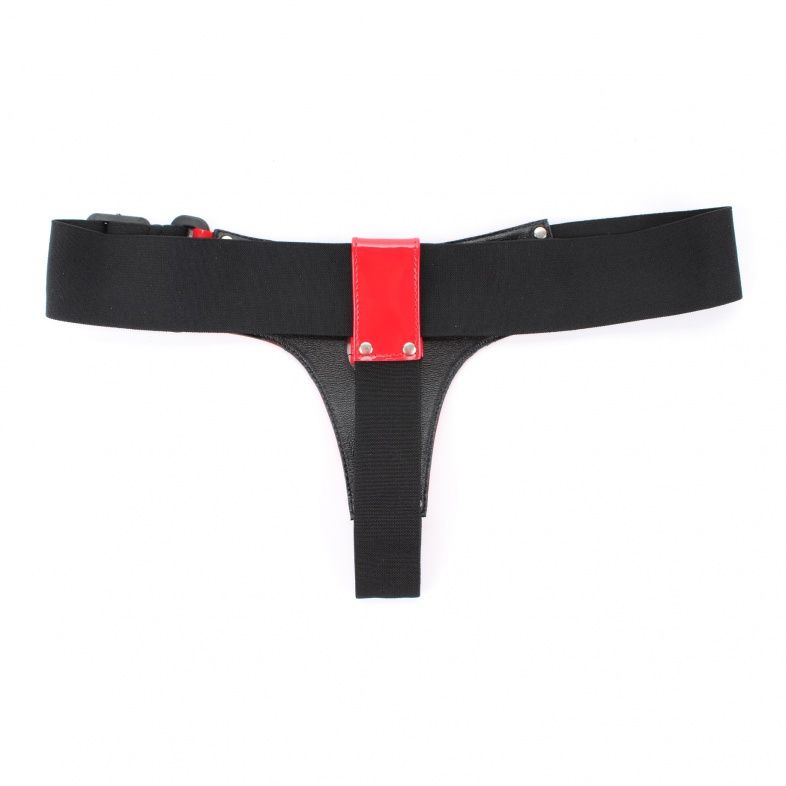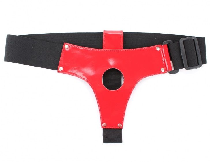 Трусики для страпона красного цвета, изготовлены блестящего лакового материала. Крепятся при помощи широких эластичных резинок (размер легко меняется) Диаметр отверстия для страпона - 4 см.