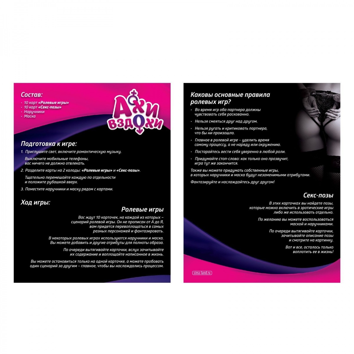 В секс-шопе Orgasmix вы можете купить Игра для двоих Ахи-вздохи. В плену страсти артикул 152096 по цене руб. с доставкой в город Санкт-Петербург. Мы осуществляем доставку по всей России. Ближайшая дата отправки этого товара . Заказы принимаются круглосуточно через интернет-магазин.