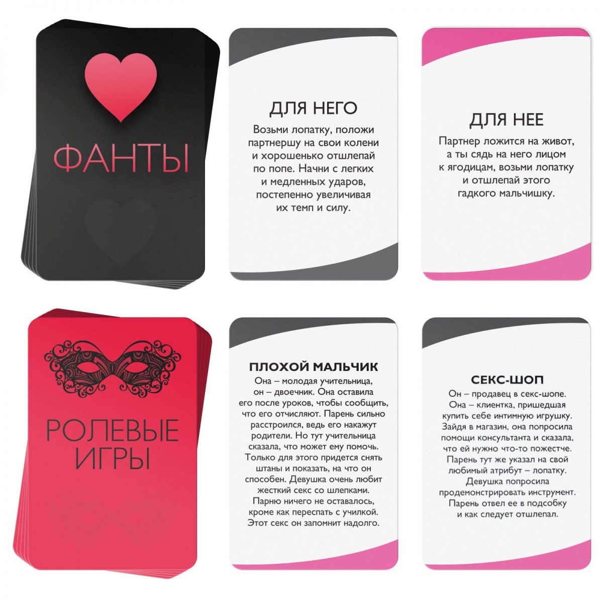 Как подарить друг другу наслаждение? Ответ прост: остаться вдвоём со своей половинкой, выполнить пикантные фанты и сыграть в ролевые игры. А получить максимальное и немного экстремальное удовольствие поможет лопатка, которая есть в комплекте. Звучит интригующе? Тогда чего же вы ждёте?! Определите, кто начнёт игру. Если это девушка, то она вытягивает карточку из колоды «Для неё». Если мужчина — «Для него». Что делать дальше? Зачитывать фант и выполнять его. Фанты — это прелюдия к самому интересному. Карточки можно использовать в процессе ролевых игр или отдельно. «Ролевые игры» - в этих карточках описаны сценарии и игры, которые вы можете попробовать, чтобы доставить друг другу незабываемое удовольствие. Изучайте карточки, выбирайте подходящие и воплощайте в жизнь! Чтобы играть было интереснее, вы можете продумать образы для перевоплощения. Правила использования лопатки: придумайте стоп-слово, выберите удобную позу, обращайте внимание на реакцию партнера. Более подробные правила использования лопатки вы можете прочитать в правилах. В комплекте: 10 карт с фантами (5 карт «Для неё», 5 — «Для него»), 10 карт «Ролевые игры», лопатка, правила игры.