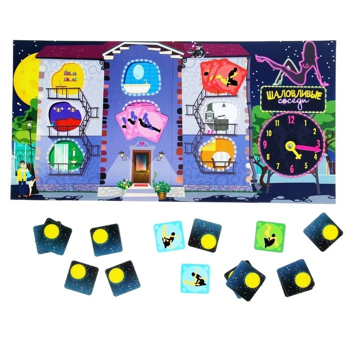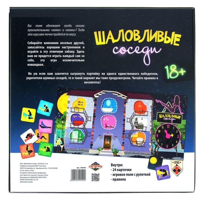 Эта игра для компании, которую одолели соседи «ахами» и «охами». Соберитесь веселой компанией и поиграйте на славу. Соседи шумят, так возьмите и утихомирьте их, все должны отправиться по своим квартирам. В этой игре могут играть от 2 участников. В процессе задействованы сразу все игроки. Цель игры - собрать всех соседей в шаловливых позах по своим квартирам за отведенное время. Время играет против вас, не смогли собрать три одинаковых карточки с соседями, стрелка передвигается на час вперед. Можете усложнять игру, когда каждый играет «сам за себя», тогда в начале игры распределите, кто каким соседям поможет попасть в свои квартиры, каждый будет отвечать за определенный цвет карточек и искать именно их. У вас есть 3 варианта игры, выбирайте тот, который больше всего нравится, и начинайте веселье! В комплекте: 24 карточки игровое поле с рулеткой правила.