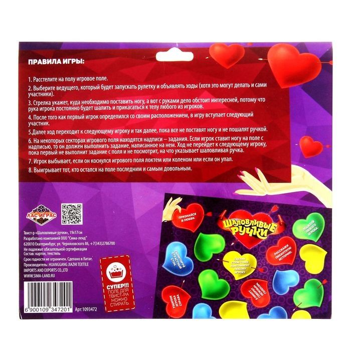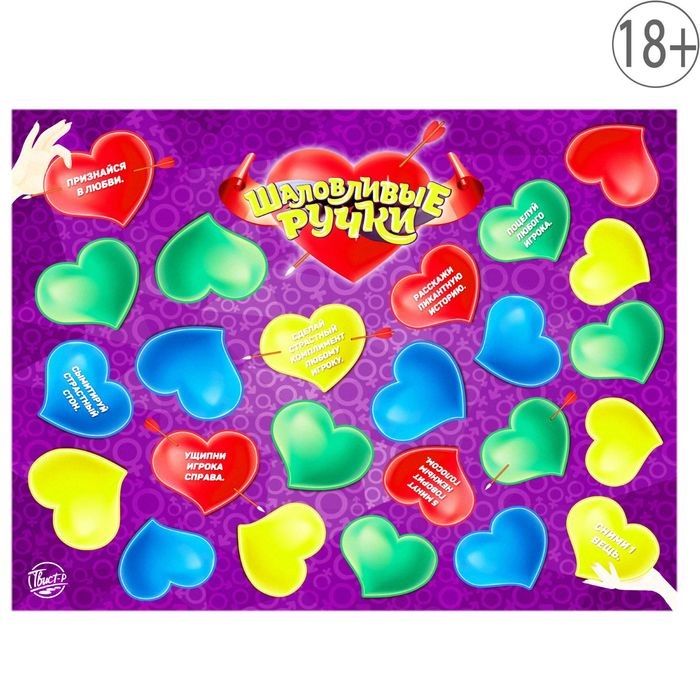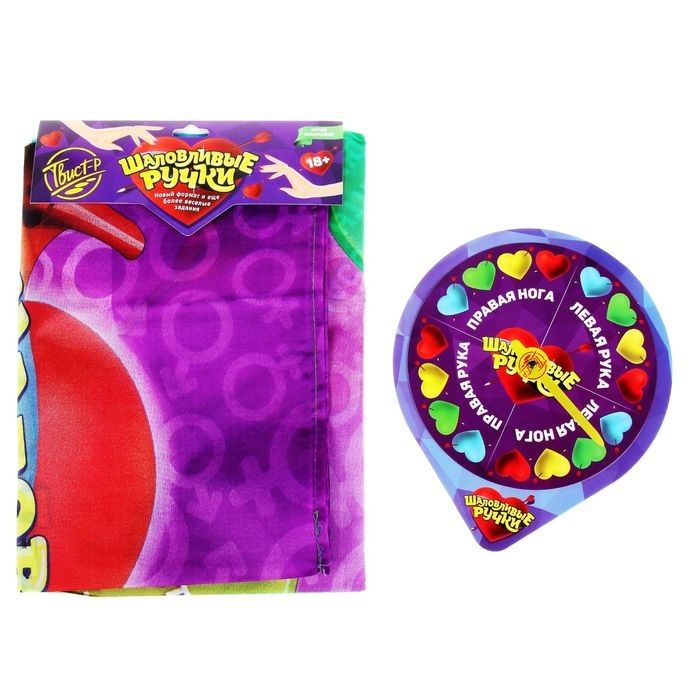 Этот твист-р для тех, кто любит пошалить, и правила в нём не похожи на прежние. Ходить по полю теперь предстоит только ногами, раскручивая рулетку. Руками же нужно обязательно прикоснуться к соседу. И только тогда ход перейдёт к следующему участнику. Можно играть парами, а можно и большой компанией! Потому что «Шаловливые ручки» станут хитом на любой вечеринке. Игра поможет поближе познакомиться друг с другом, немного расслабиться и отлично повеселиться. Соберите компанию друзей и проведите время незабываемо! Этот твистер вы сможете взять куда угодно! Он выполнен из материала, который допускается чистить даже с помощью стиральной машины. Размер игрового поля рассчитан на большую компанию. В комплекте: текстильное игровое поле 1,5 х 1,2 метра рулетка.