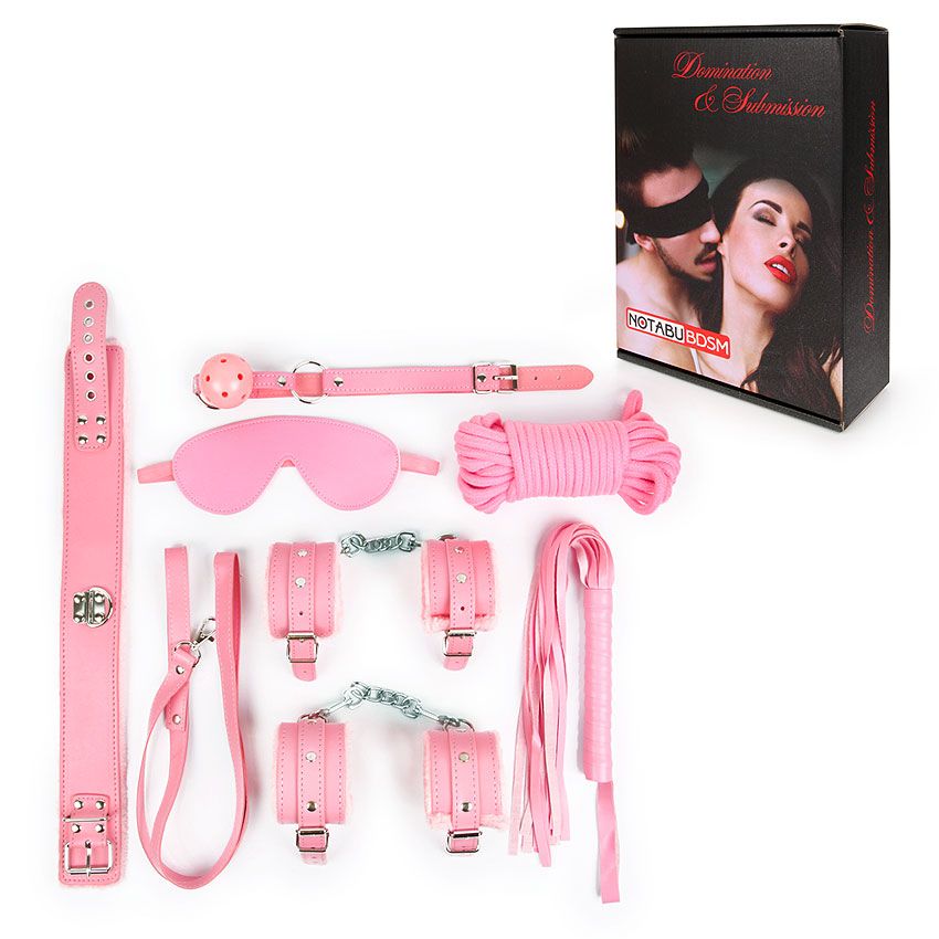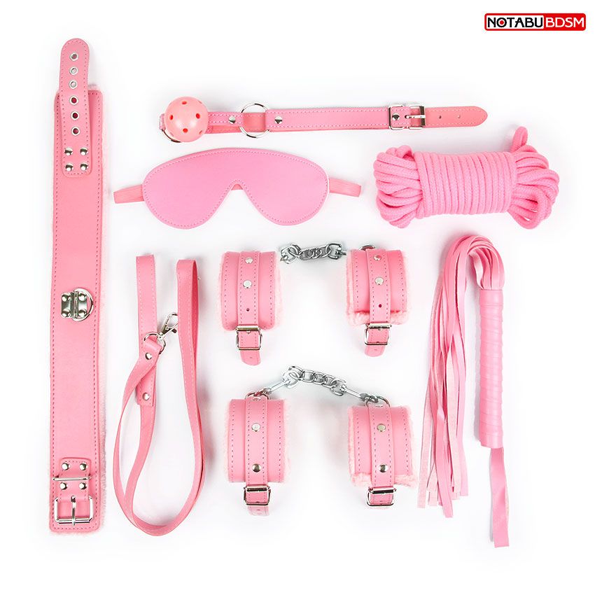 Великолепный набор аксессуаров для любителей БДСМ. В комплект входят кляп, наручники, оковы, ошейник, поводок, верёвка, маска, плеть. Кляп состоит из пластмассового шарика с отверстиями для дыхания и ремней с возможностью регулировки размера. Наручники и оковы снабжены металлической цепочкой, которая позволяет скреплять изделия вместе. Внешняя сторона наручников, оков, ошейника и маски выполнена под кожу, внутренняя отделана мехом, который предотвращает натирание кожи. Плеть-флогер состоит из хвостов и отделанной искусственной кожей рукоятки с петлей. В комплекте: кляп, наручники, оковы, ошейник, поводок, верёвка, маска, плеть.
