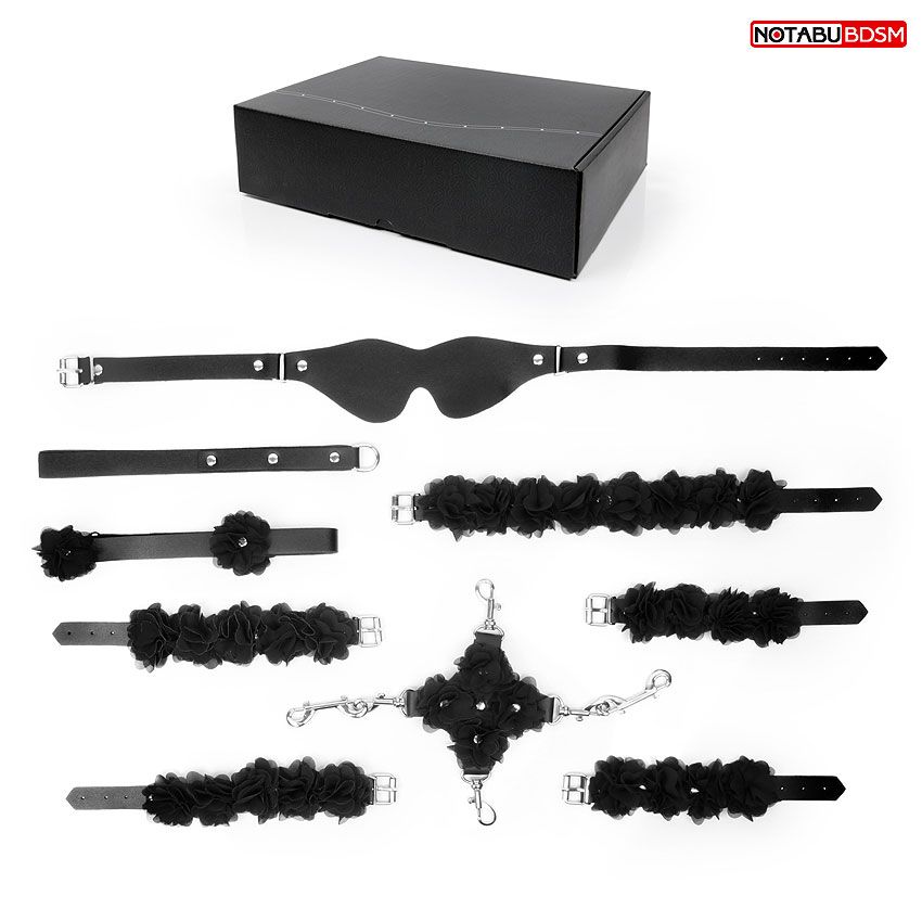 Великолепный набор аксессуаров для любителей БДСМ-игр. В комплект входят маска, фиксатор, ошейник с поводком, наручники, оковы, шлёпалка. Наручники, оковы, ошейник и маску можно регулировать по размеру. Изделия украшены декоративными цветами и оснащены качественной фурнитурой. В набор входит специальная сумка с ручкой-цепочкой для хранения интимных аксессуаров и презентабельная упаковочная коробка. В комплекте: маска, фиксатор, ошейник с поводком, наручники, оковы, шлёпалка. Длина шлепалки - 25 см.