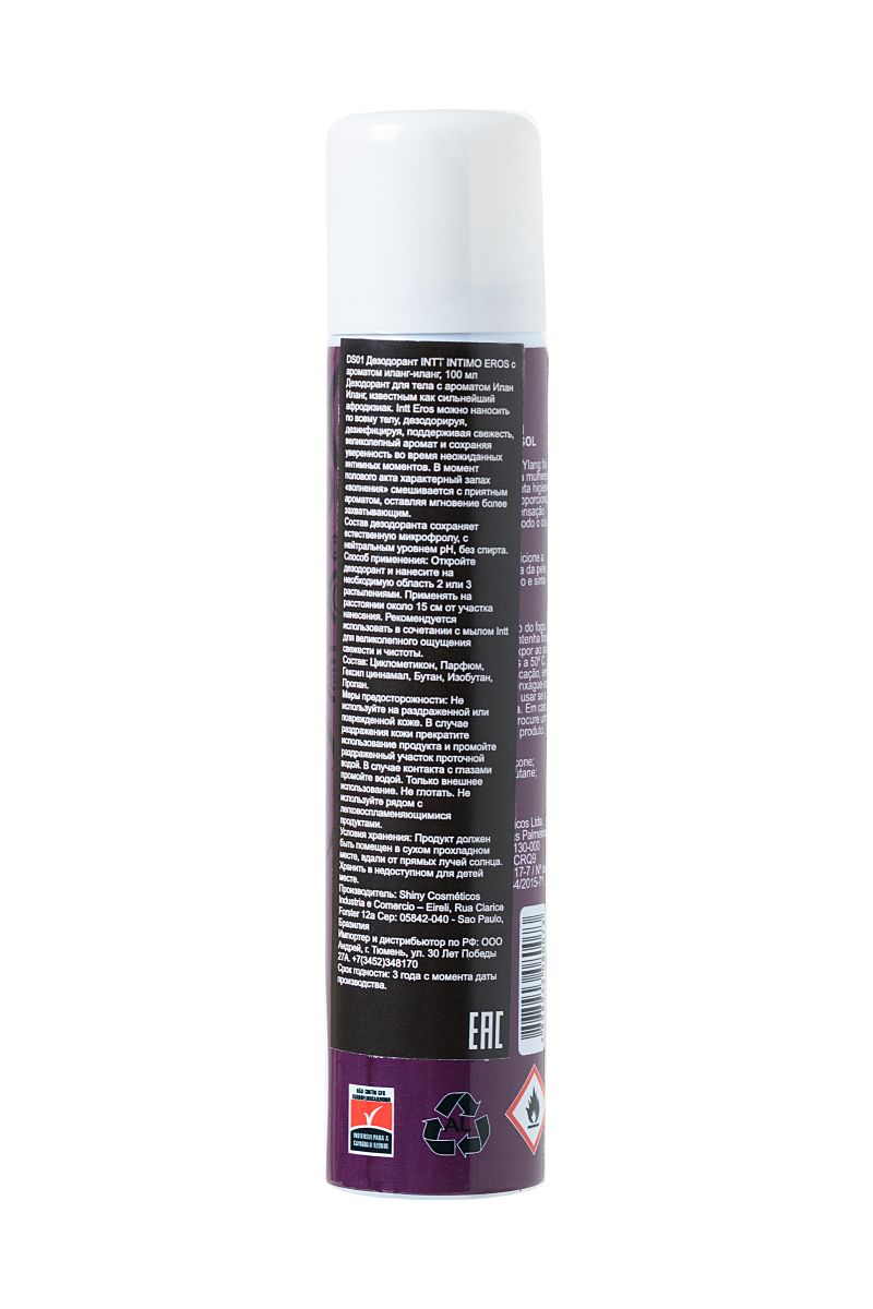 Дезодорант для интимной гигиены Intt Intimo Eros — ваш источник свежести на весь день. Подходит для ежедневного использования. Дарит ощущение свежести с тонким ароматом иланг-иланга. Просто нанесите спрей после душа на сухую кожу. Поддерживает нейтральный pH и ухаживает. Благодаря безопасной формуле без спирта обеспечивает бережный уход за интимной зоной, дезодорирует и дезинфицирует. Не вызывает аллергии. Усиливает эмоции от близости. Возбуждающий аромат иланг-иланга раскрывается во время секса и помогает полностью раскрепоститься и отдаться страсти. Подарите себе новые ощущения с INTT.