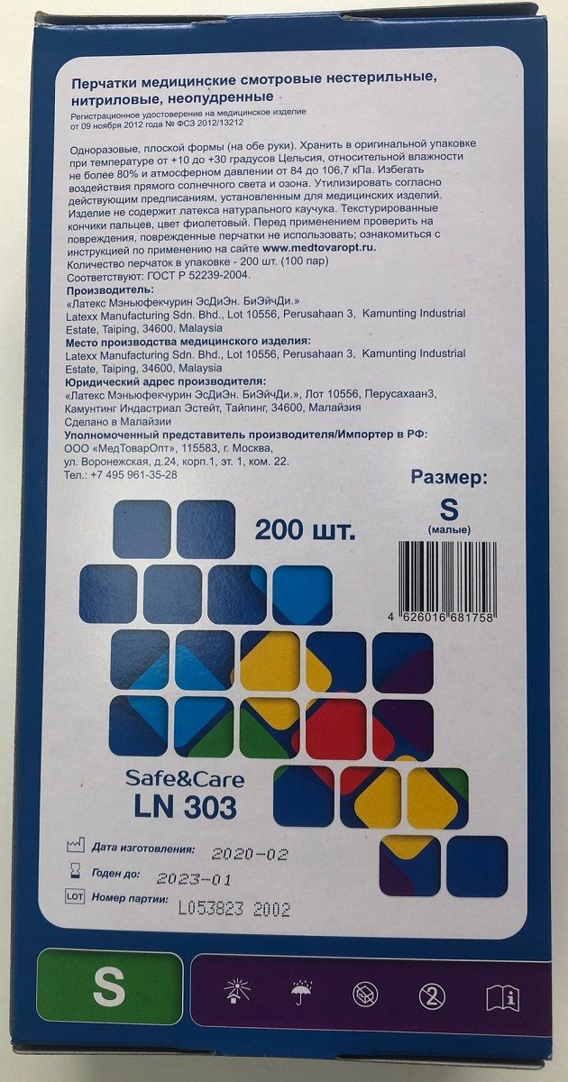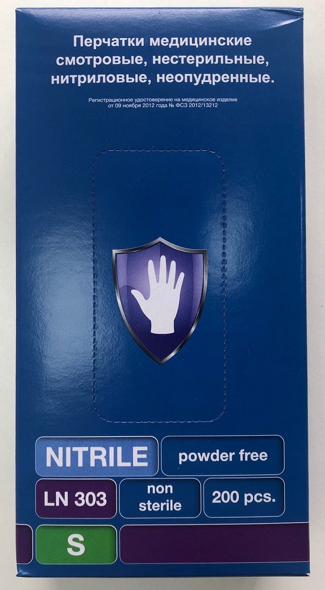 Перчатки медицинские смотровые из искусственного нитрила Safe&Care LN 303. Текстурированная поверхность на пальцах, универсальной плоской формы, манжета с валиком, гипоаллергенные, нестерильные. Состав перчаток не содержит протеинов латекса натурального каучука и не вызывает аллергических реакций. Длина - 245+/-5 мм. Толщина пальца (13 мм от кончика) - 0,16+/-0,02 мм. Толщина ладони (центр) - 0,15+/-0,02 мм. Толщина манжеты (25 мм от валика) - 0,10+/-0,02 мм. Герметичность AQL 1.5